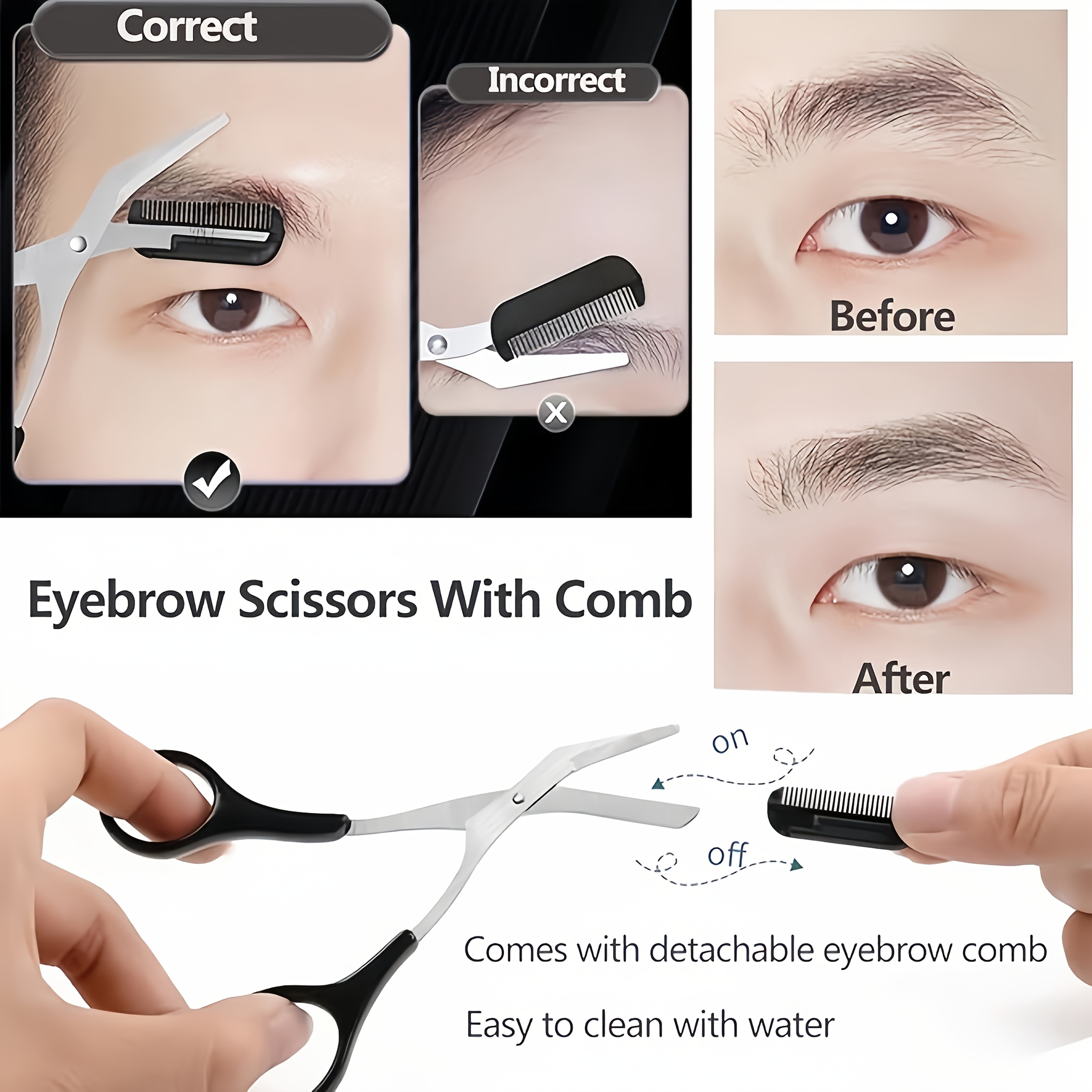 This stainless steel eyebrow trimmer features a built-in comb for precise eyebrow shaping. The durable trimmer can be used with either hand, helping you create perfect eyebrows. Compact and portable, it’s an essential makeup tool for travel.
