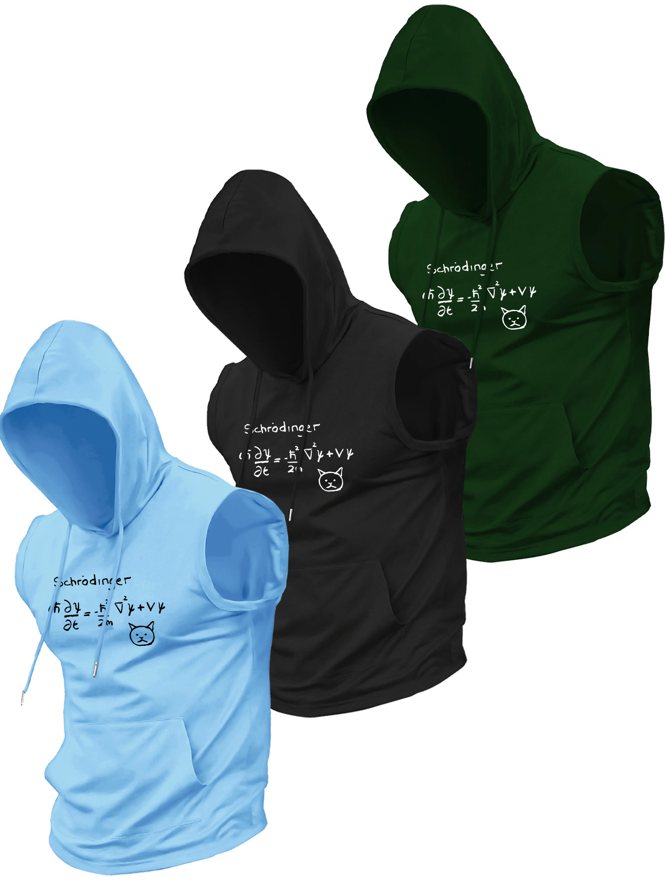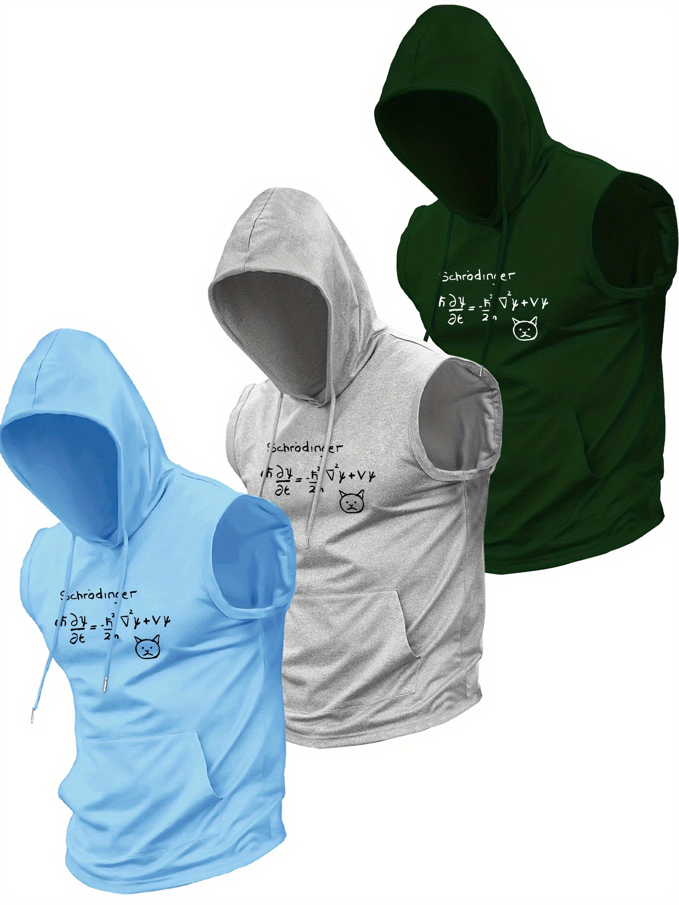 Three-Piece Set of New Summer Men’S Casual Sports Hooded Vest Tops, with Kangaroo Pocket Design, Knit Fabric, Cool and Comfortable, Quantum Mechanics Print Sleeveless Hooded Vest Tops, Multi-Pack, Easy to Wash, Suitable for Outdoor Activities and Boxing