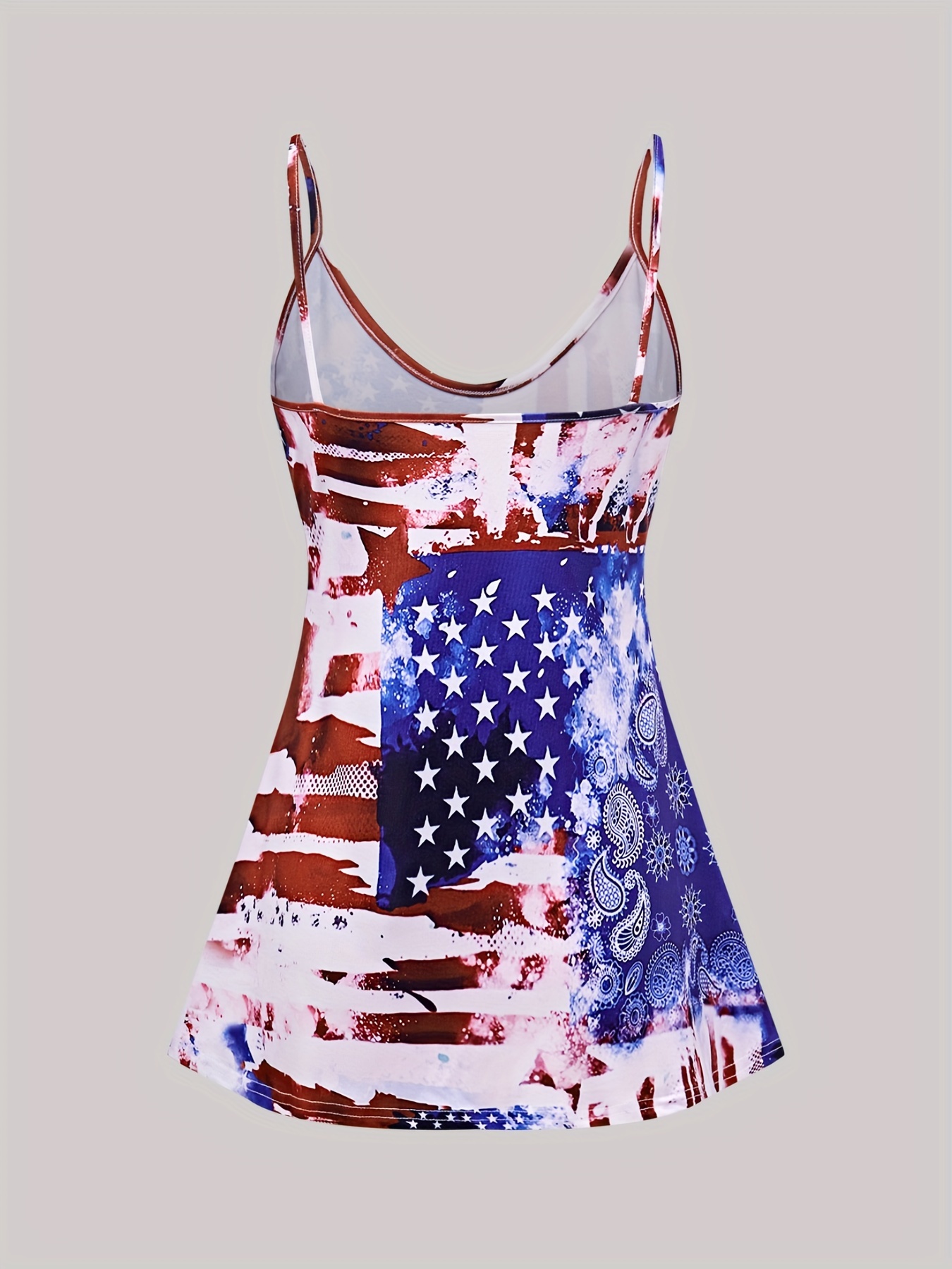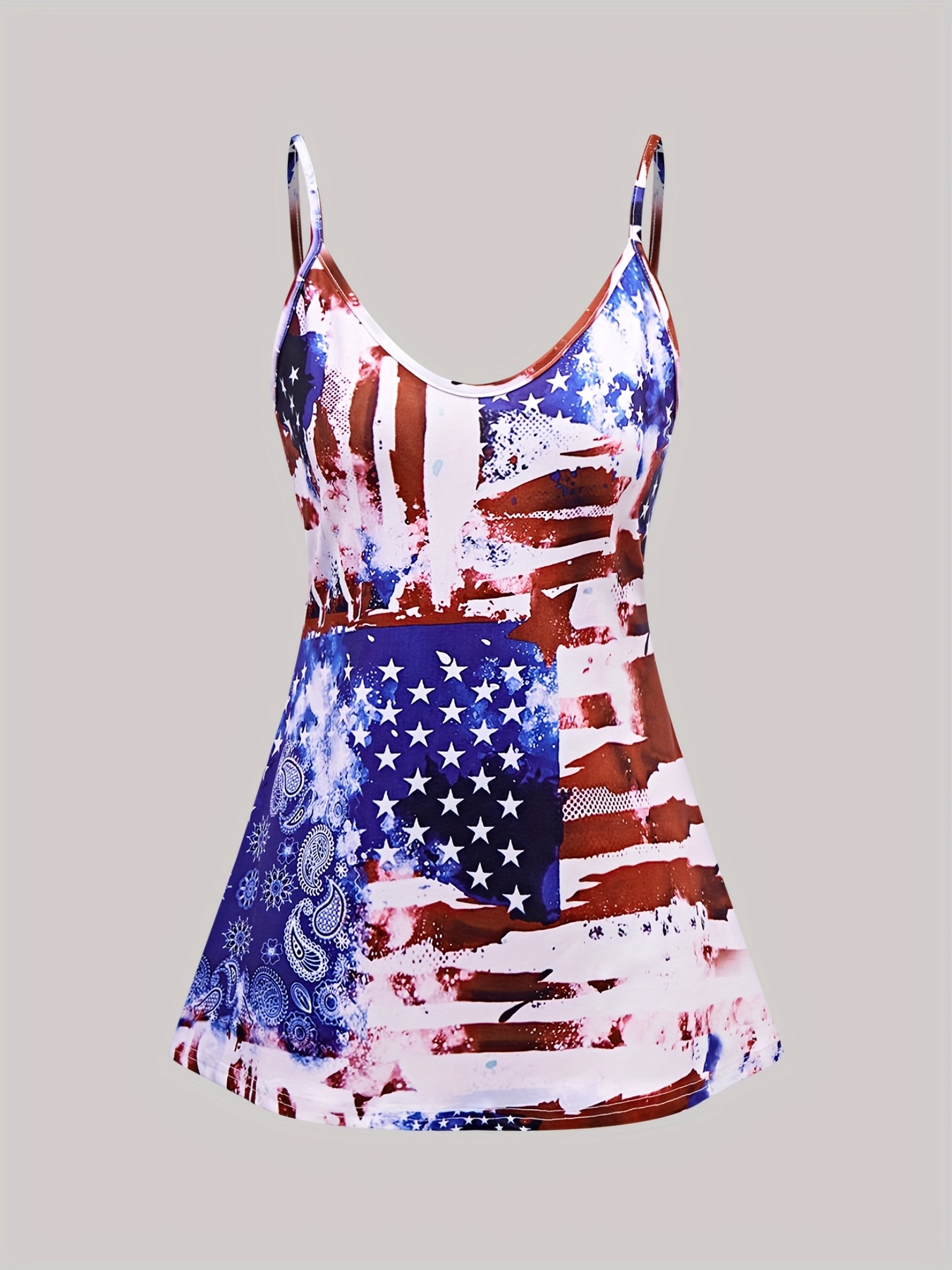 Two-piece Set American Flag Print Scoop Neck Sleeveless Strap Flare Top & Skinny Capri Leggings Outfits, Women’s Casual Clothing