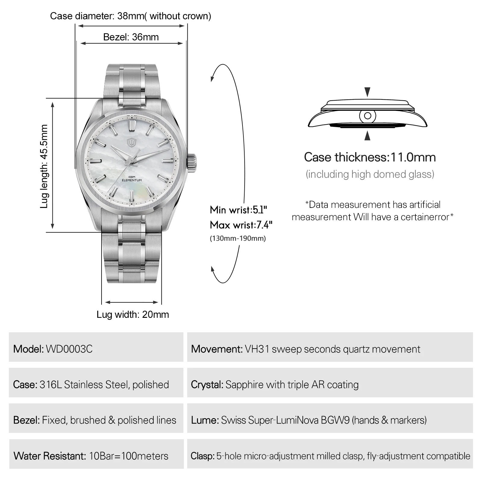 * Case: 316L Stainless Steel, polished