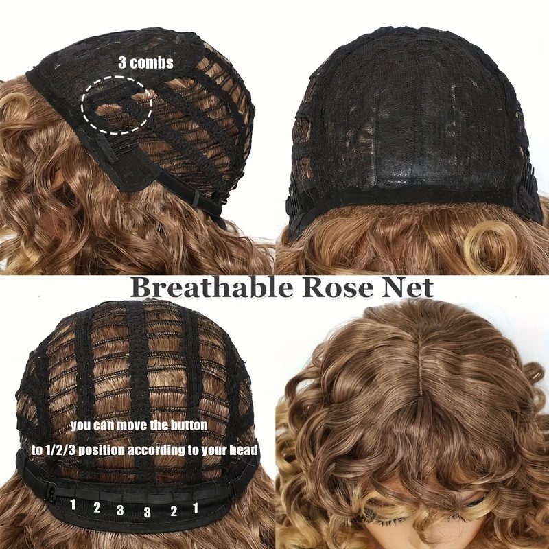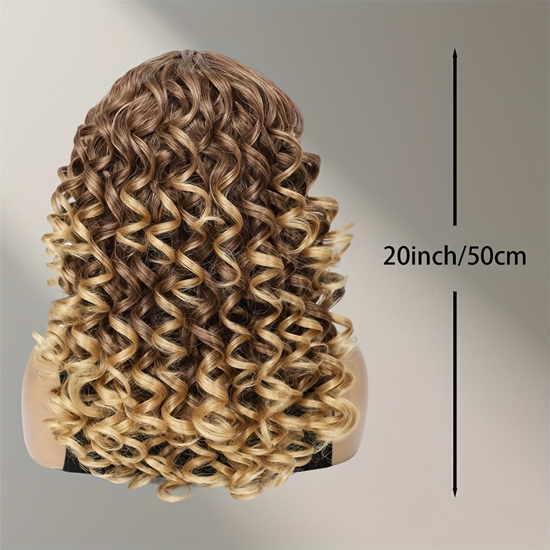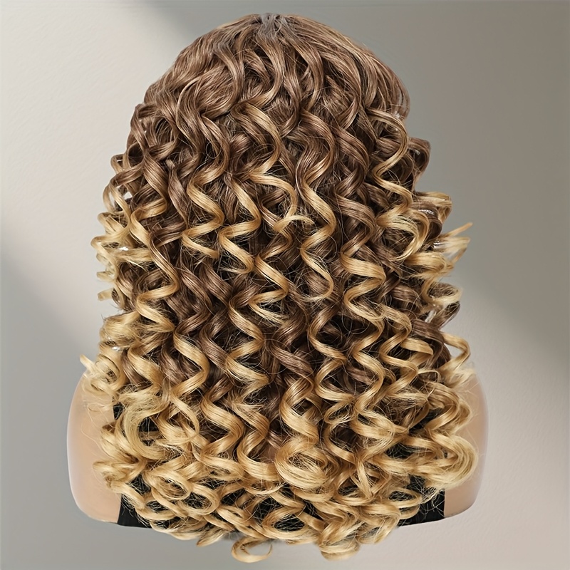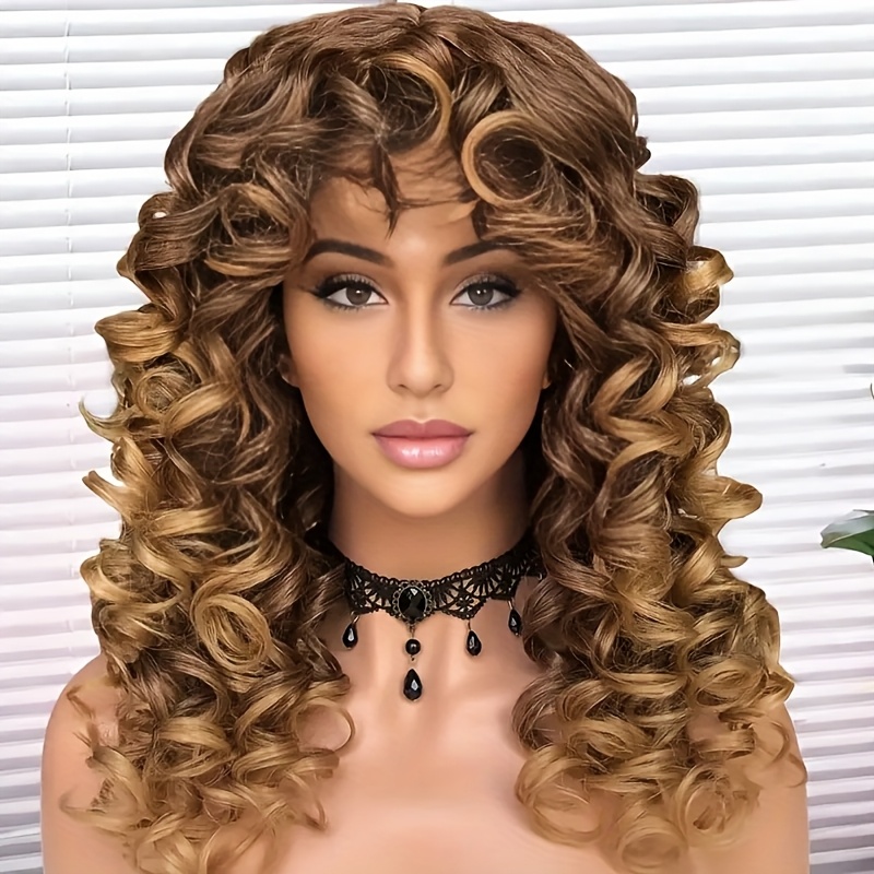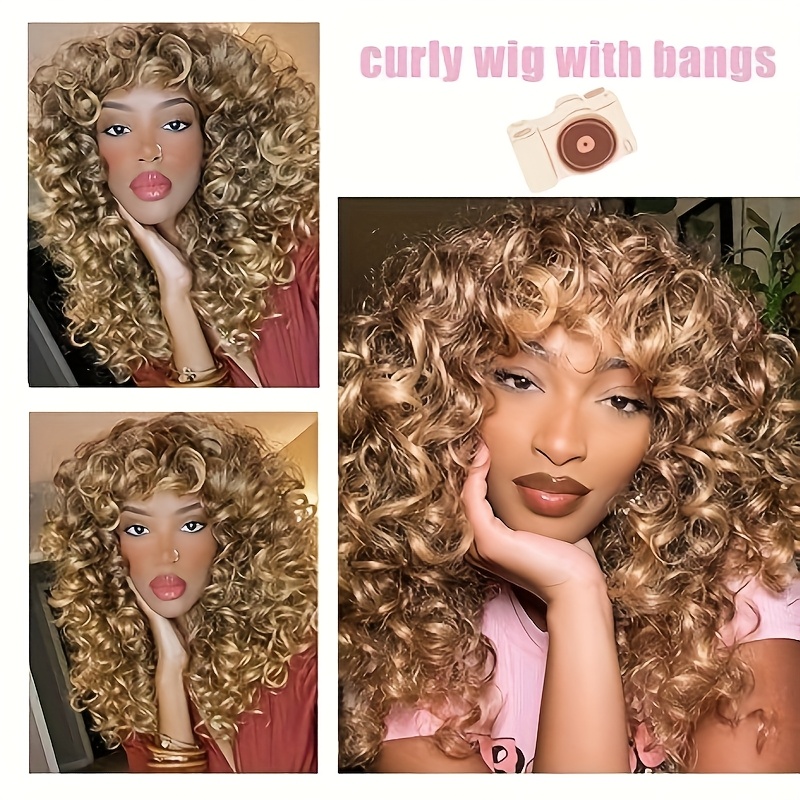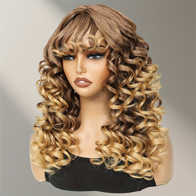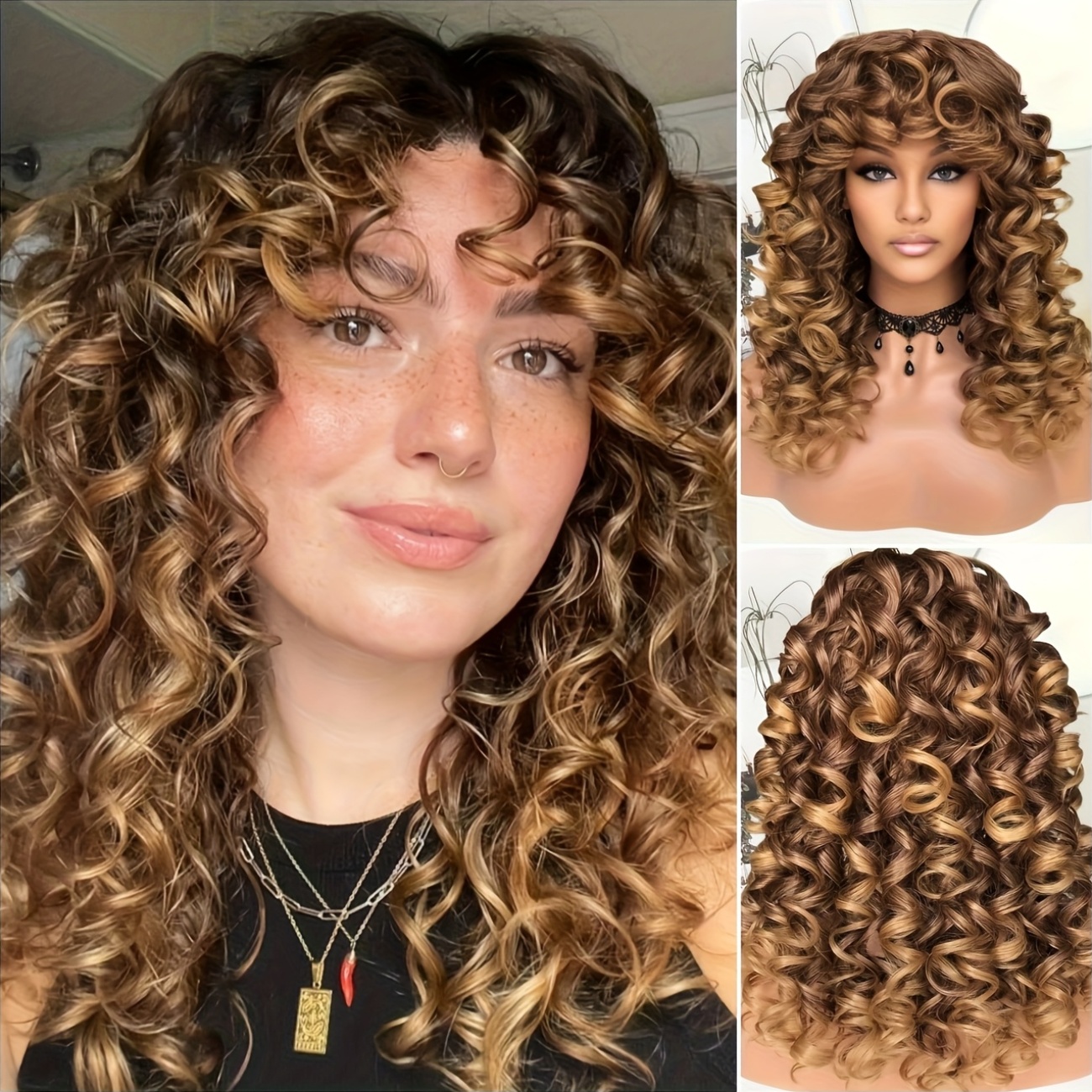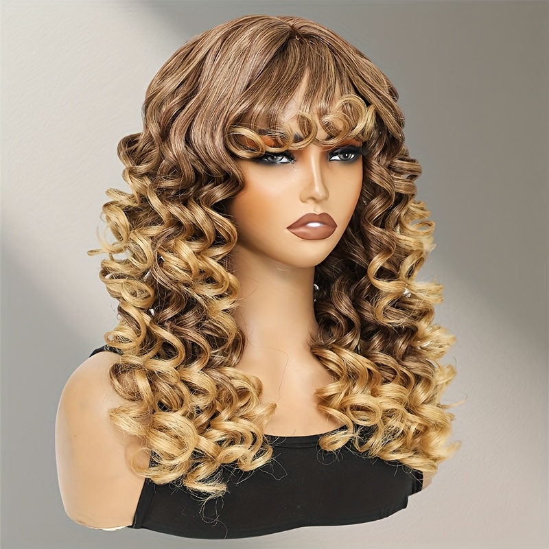 Women’ Long Curly Ombra Afro Kinky Wig with Bangs – Glueless Synthetic Hair Suitable for Cosplay, Daily & Party Use – Brown/Blonde Highlights, Bouncy Fluffy Afro Curly/Kinky Wigs for all Hair Types (No Glue Application)