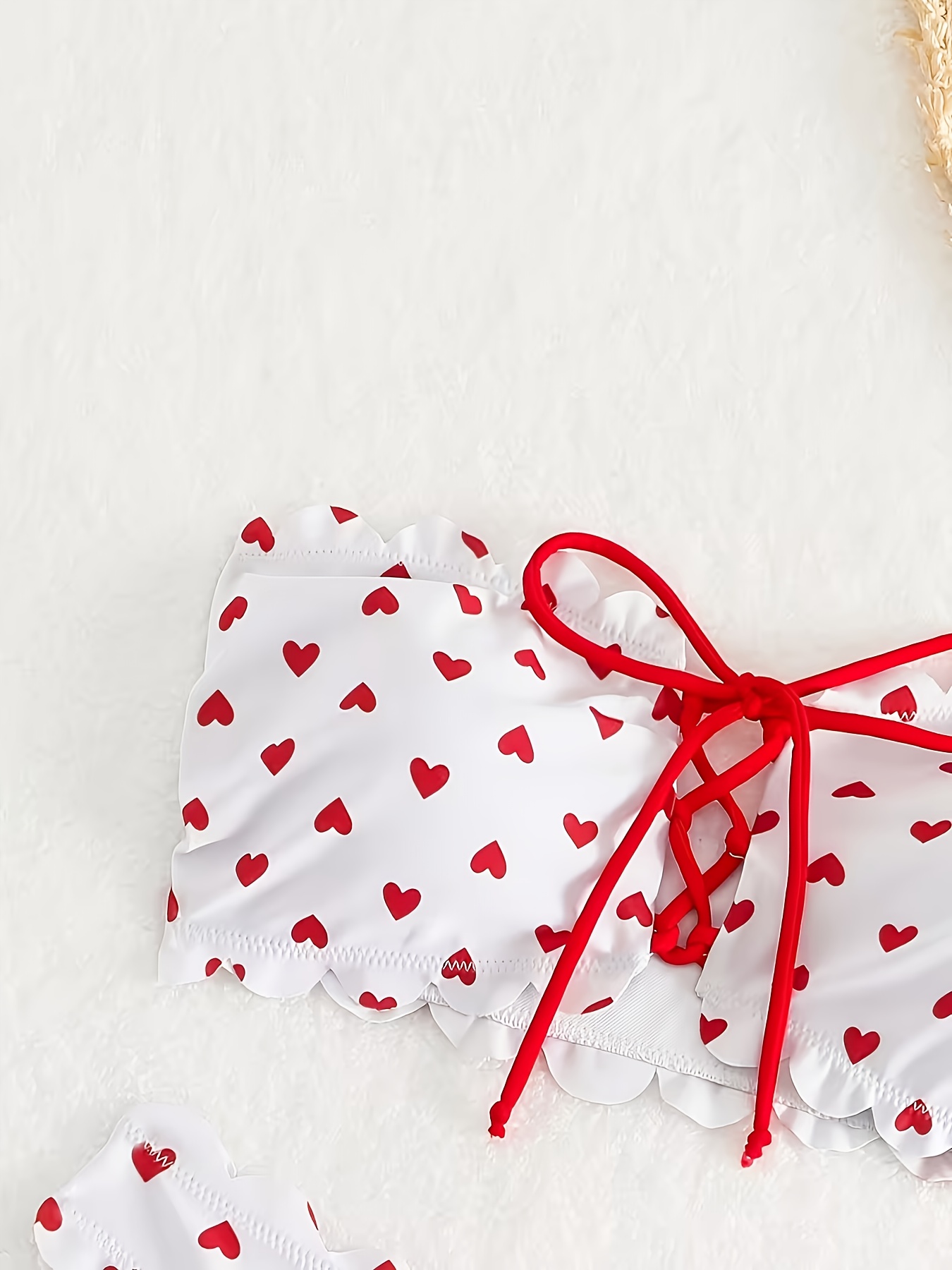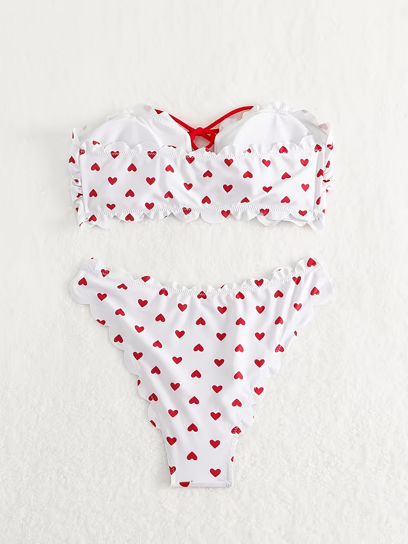 Women’s Bestselling Sexy Bikini Swimwear Set Red Heart Print Scalloped Edge Bandeau Tie Design Separate Style Romantic Bold Style Suitable for Beach Vacation And Date Wear Fully Showcases Feminine Curve Charm