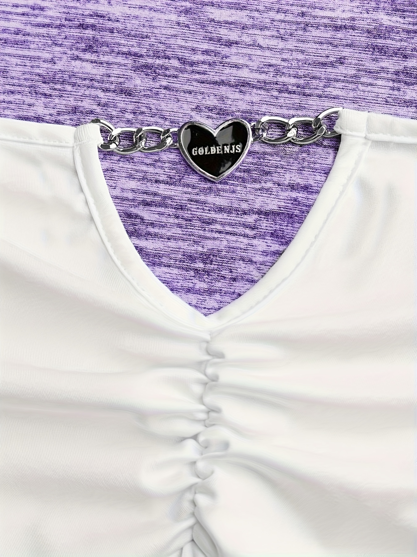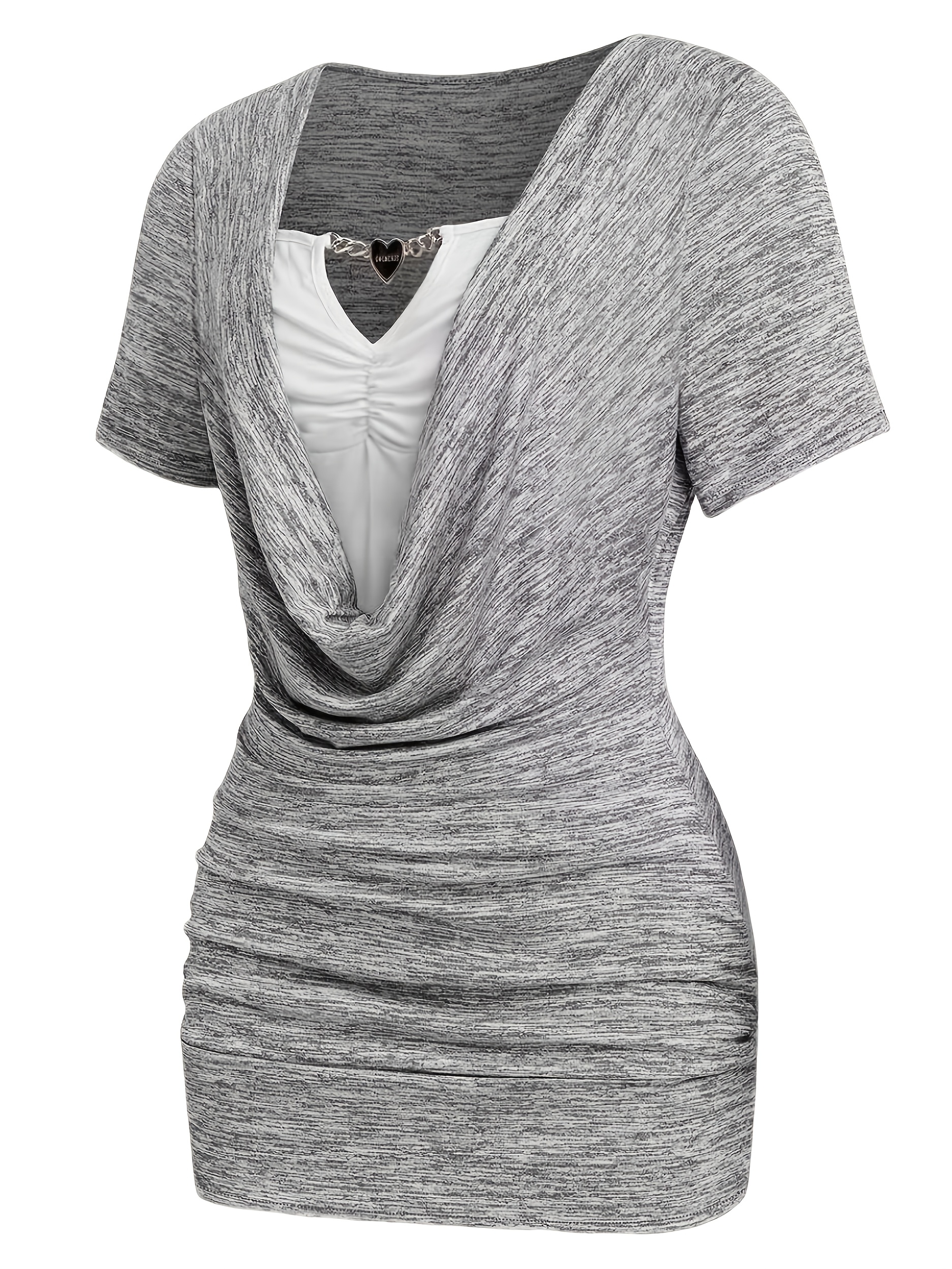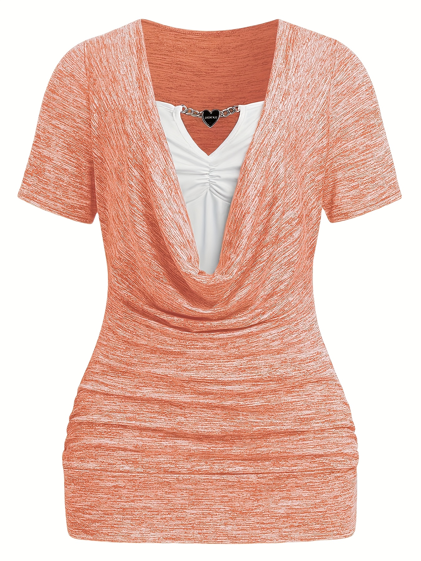 Women’s Buckle Chain Spliced Pleated Texture Casual Summer Short Sleeve Top Faux Two-Piece T-Shirt
