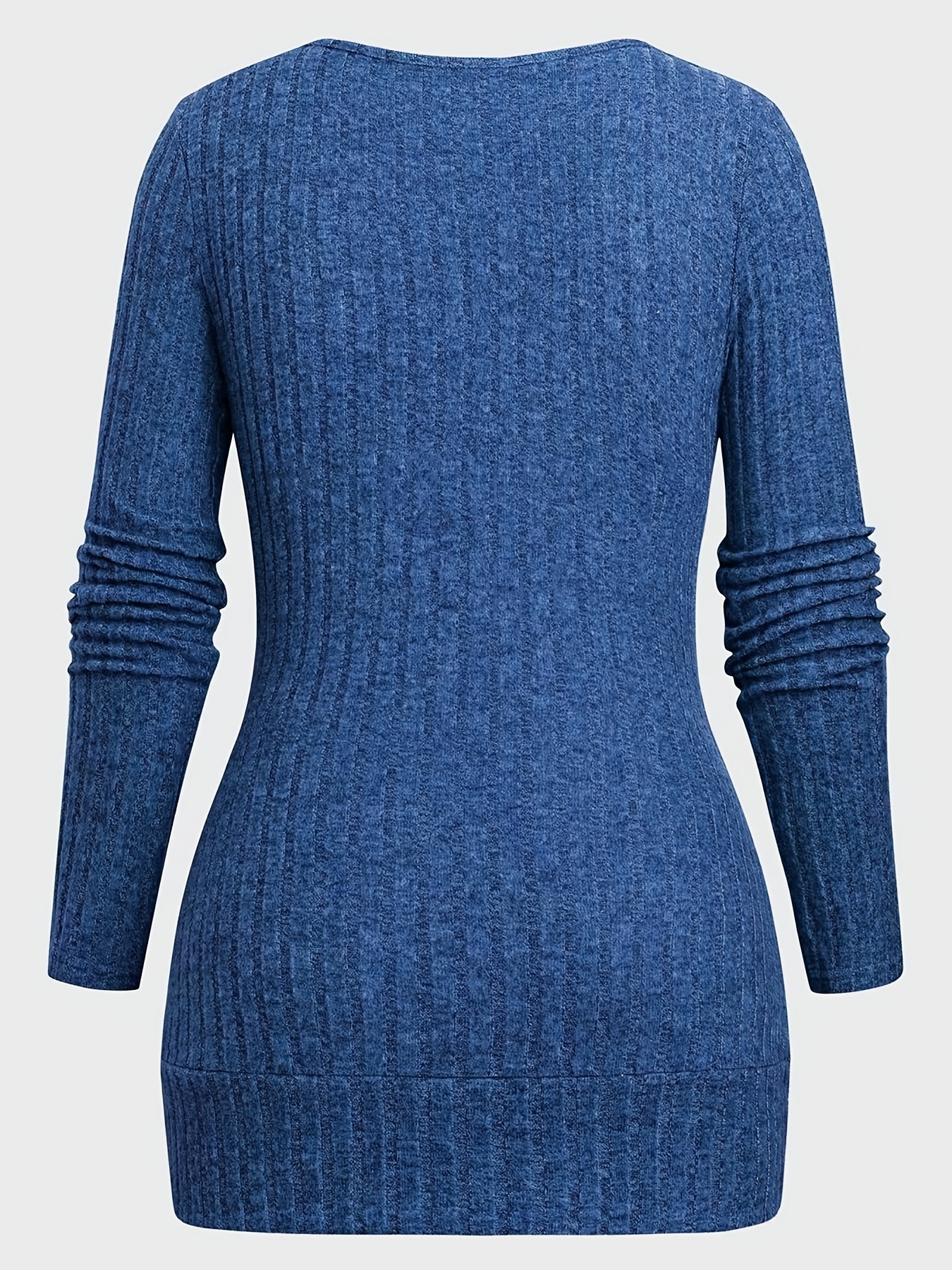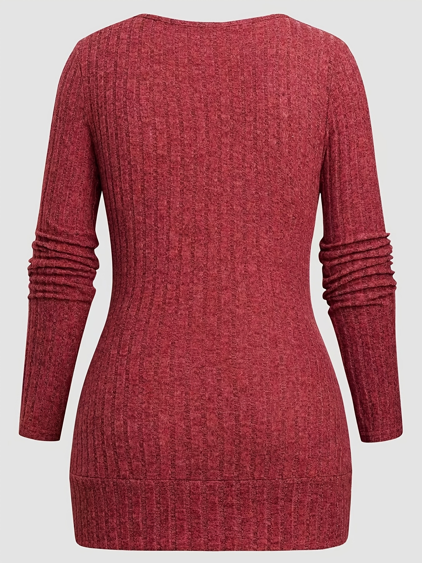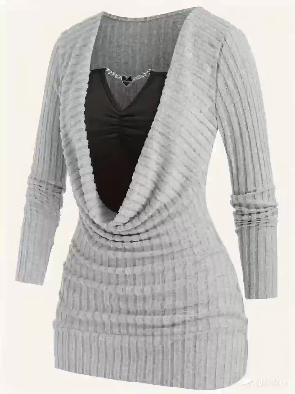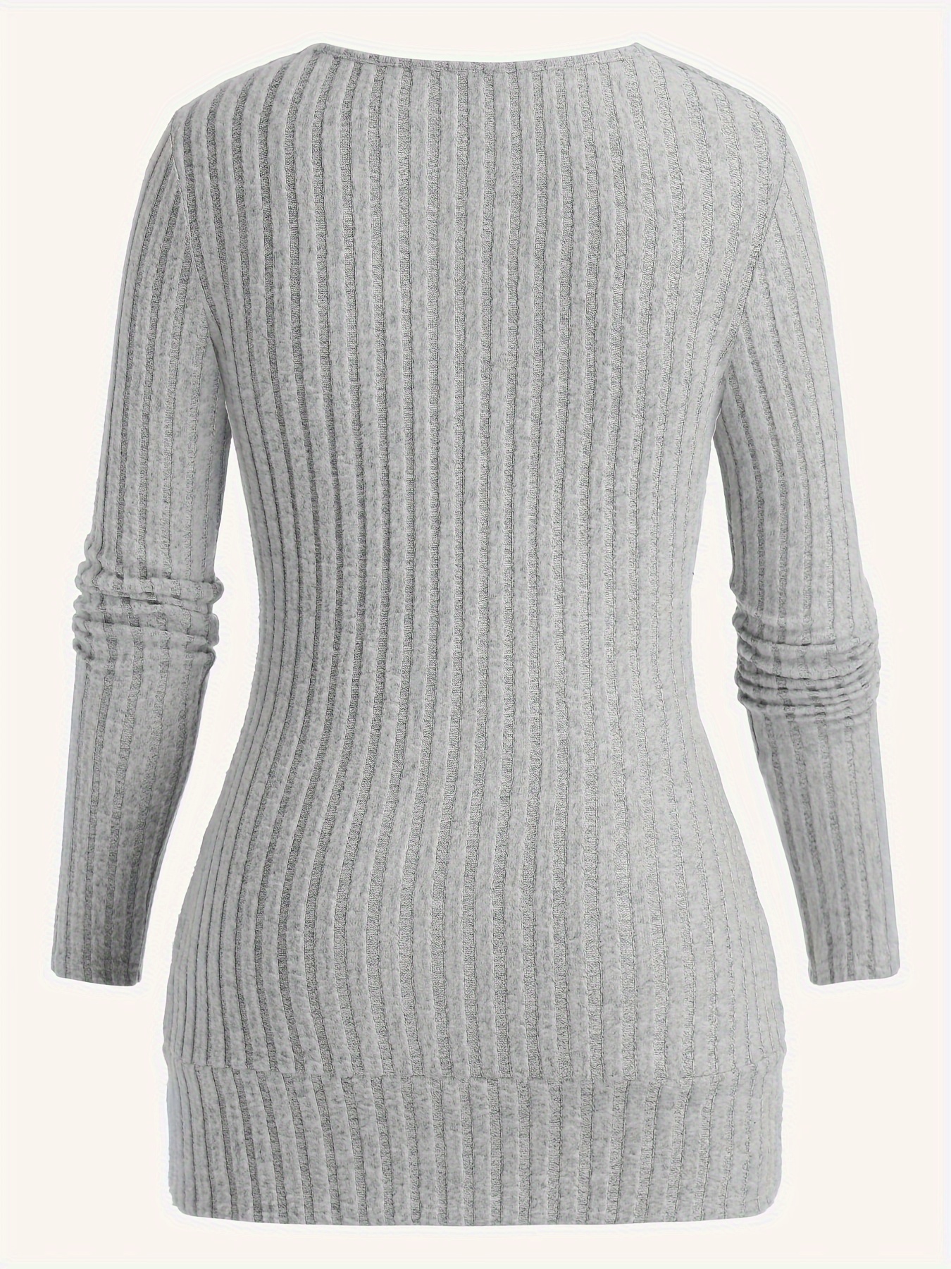 Women’s Buttoned Chain Stitching Pleated Textured Light Gray Ribbed Fleece T-Shirt for Autumn and Winter Casual Wear