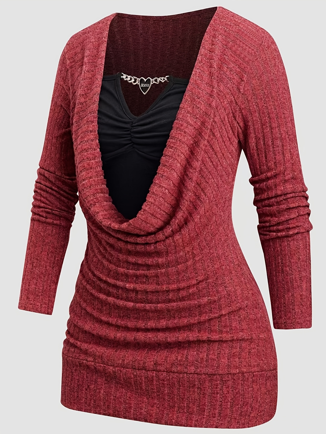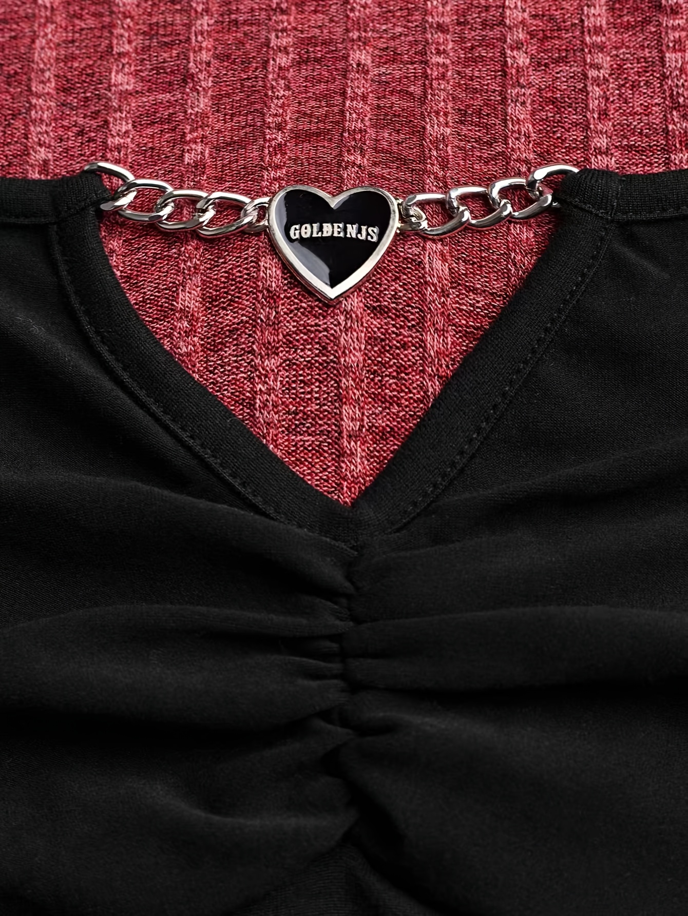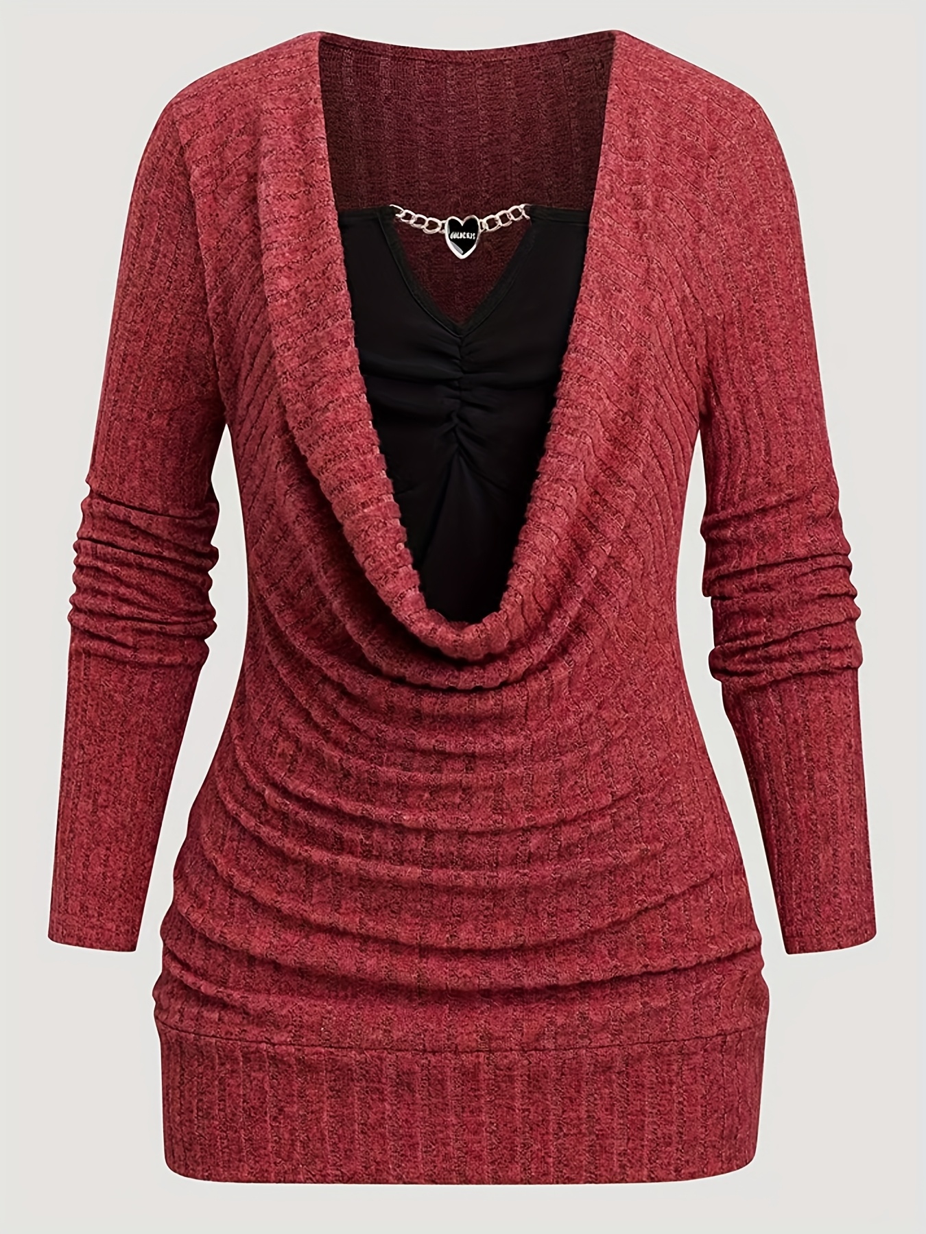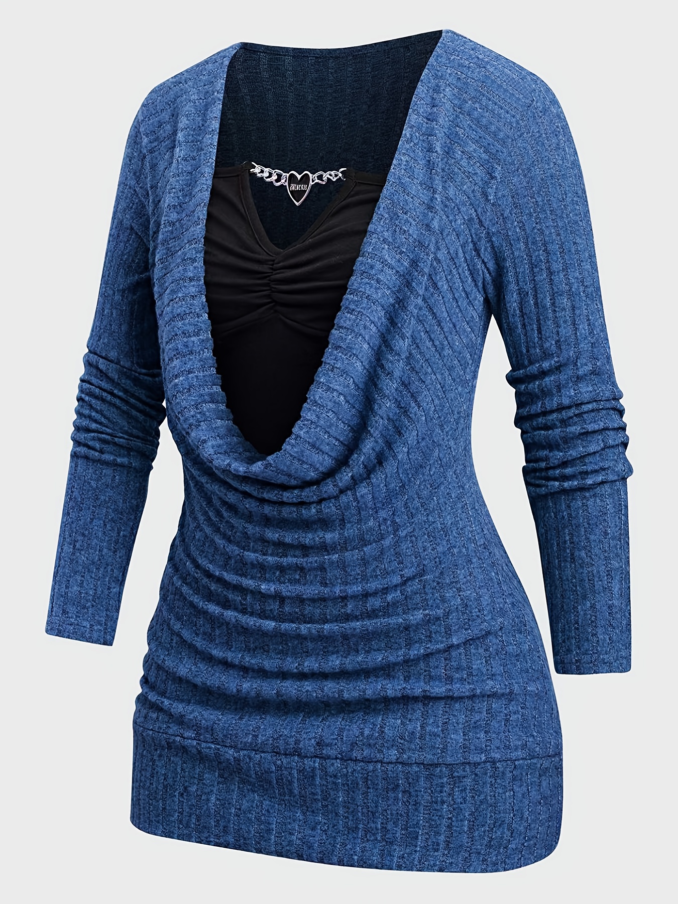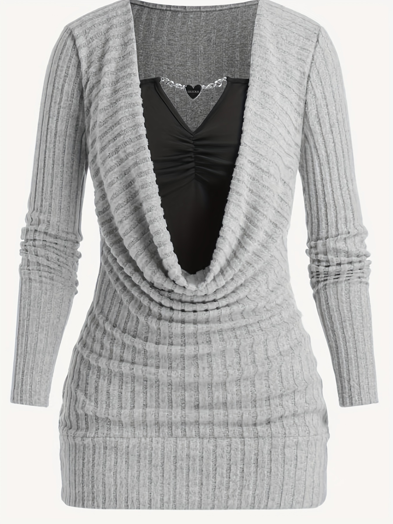Women’s Buttoned Chain Stitching Pleated Textured Light Gray Ribbed Fleece T-Shirt for Autumn and Winter Casual Wear