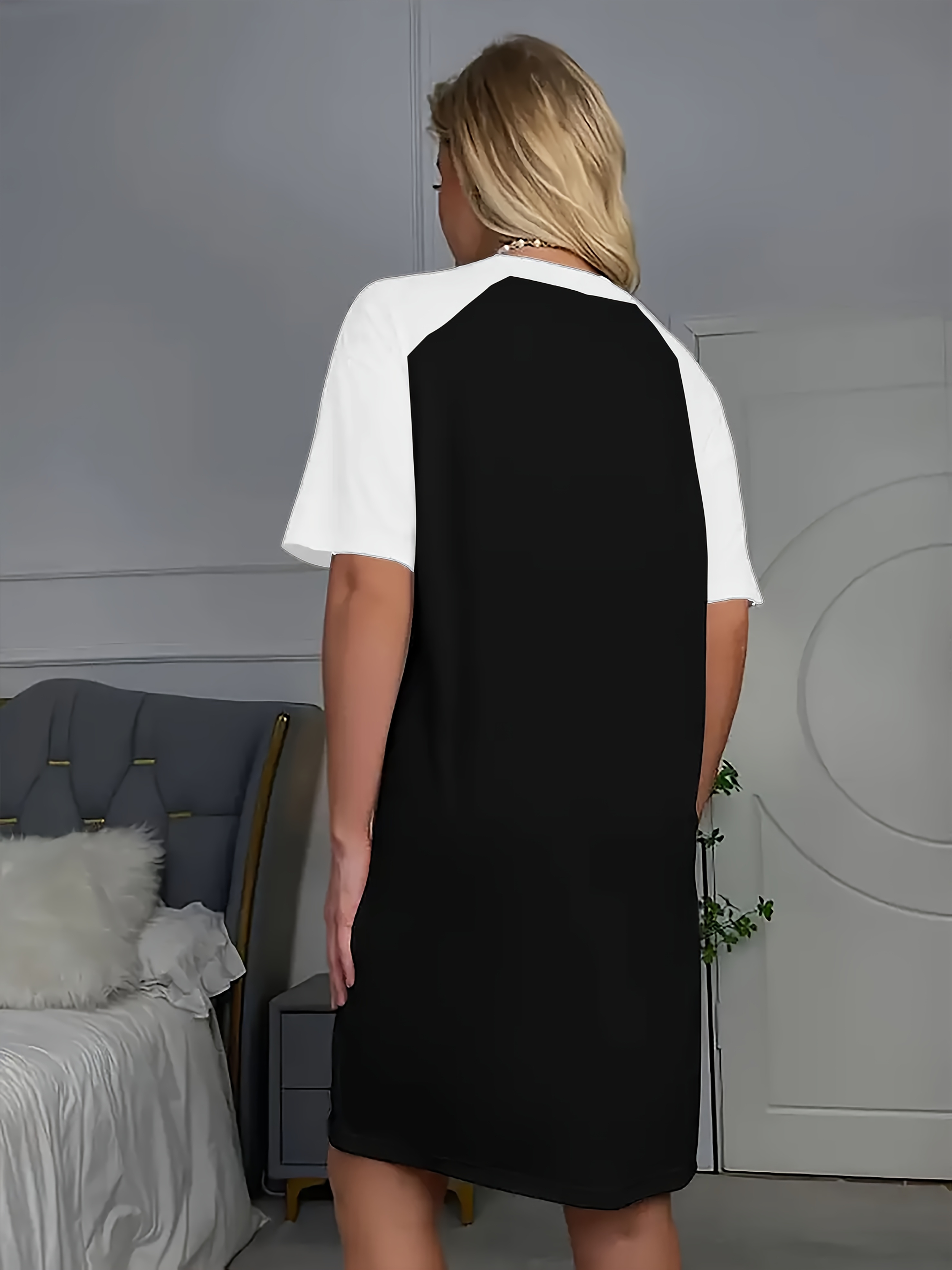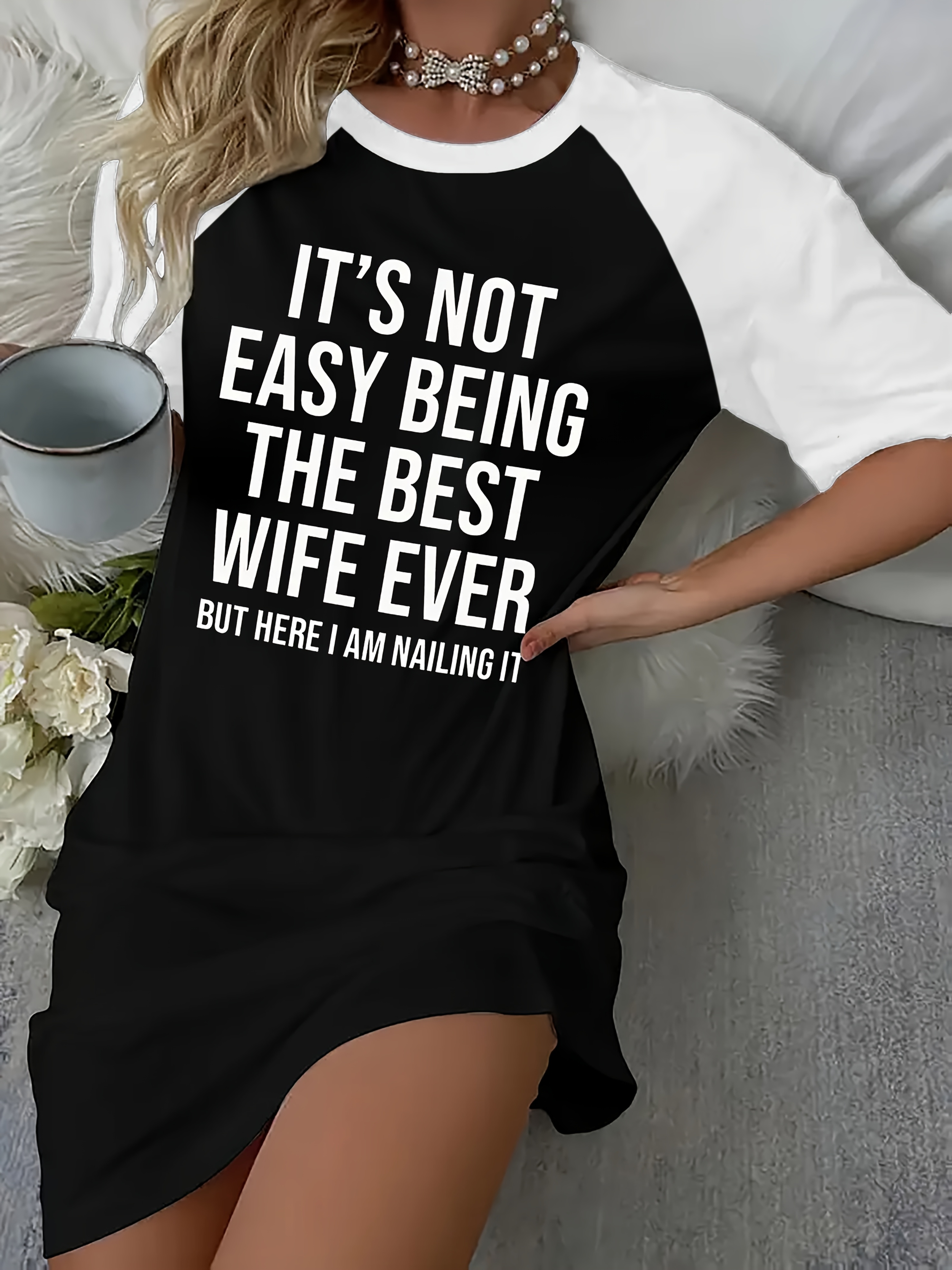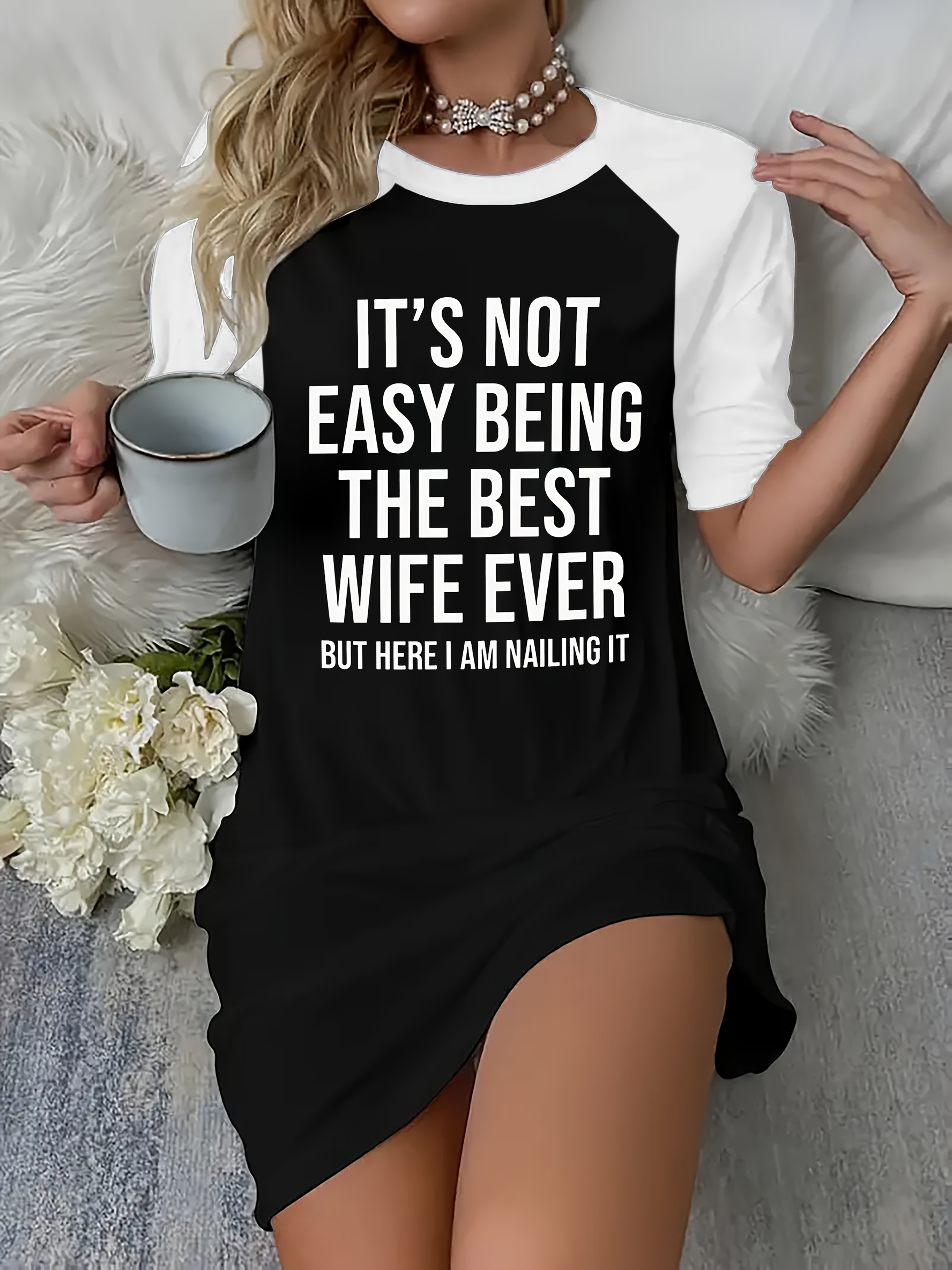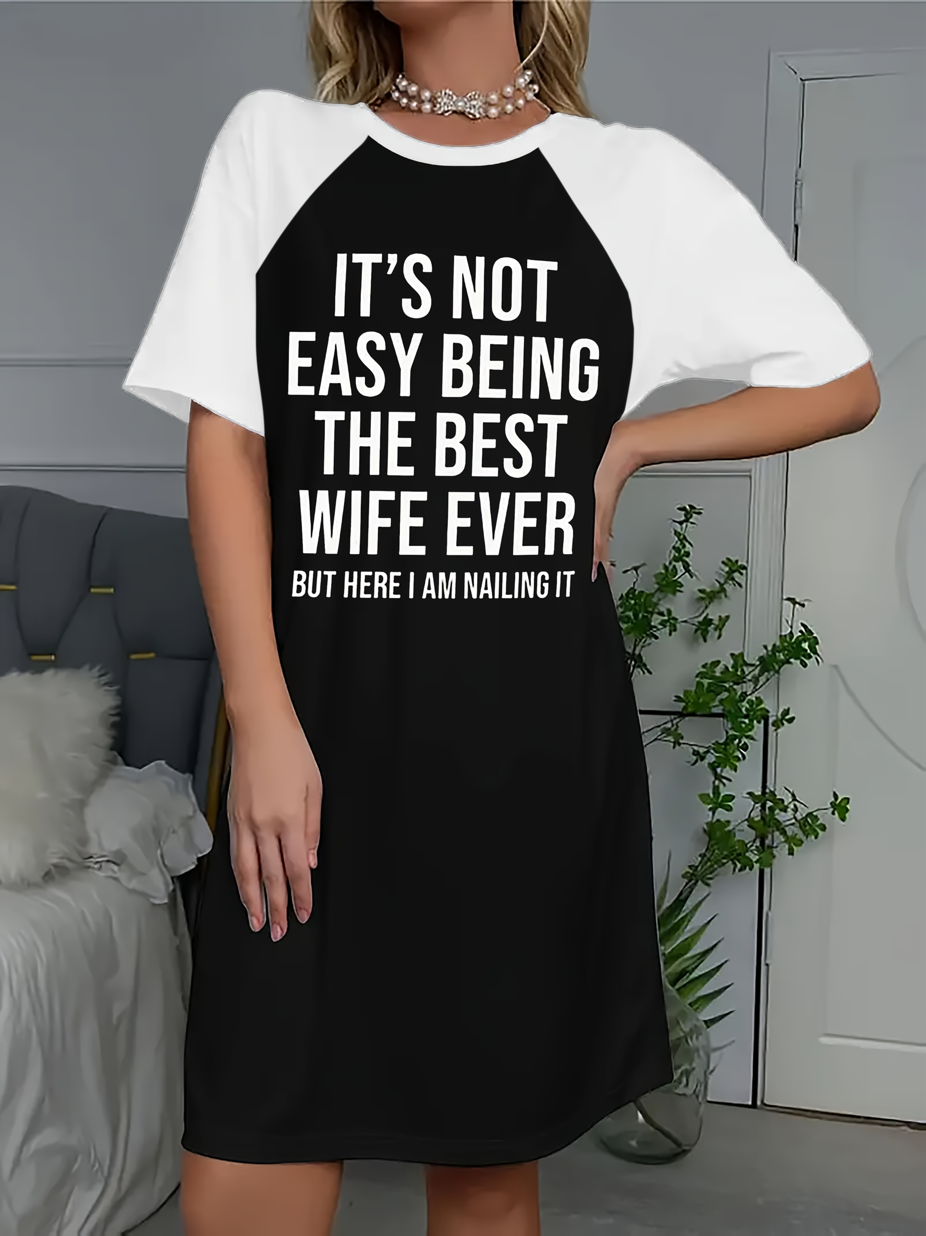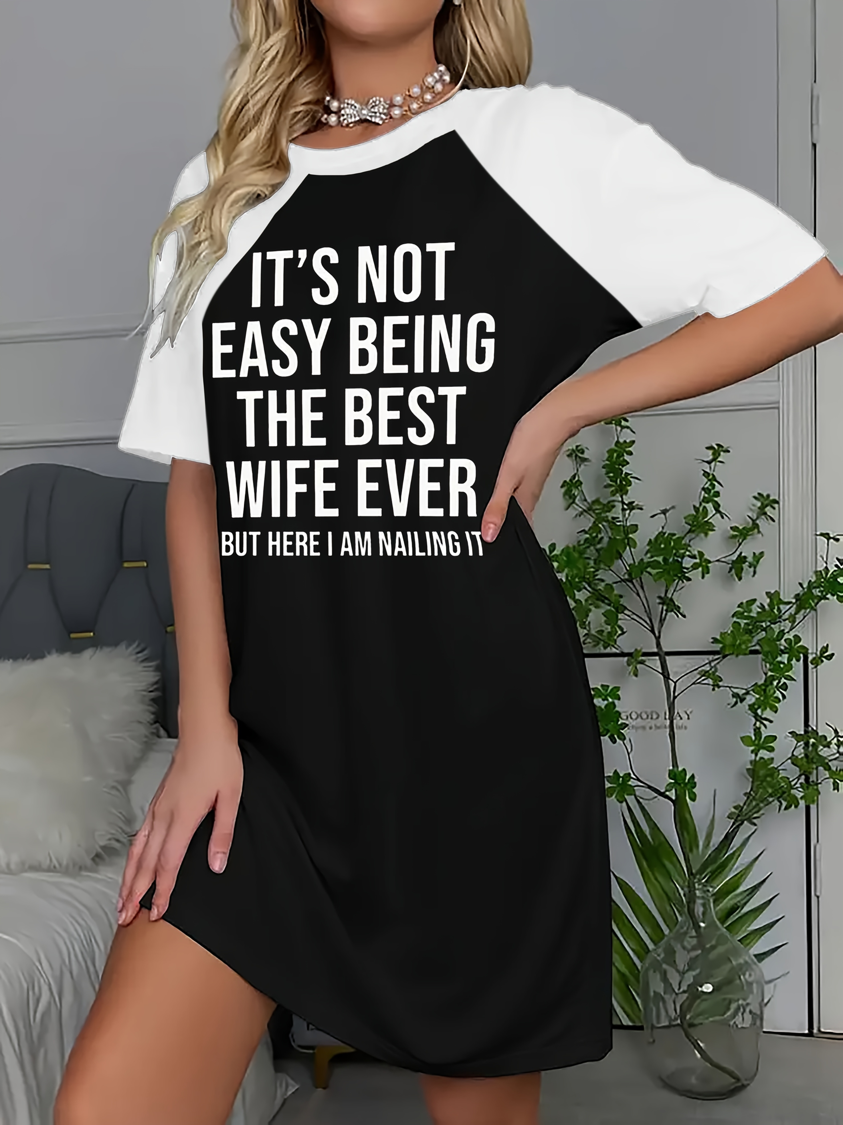 Women’S Casual Short Sleeve T-Shirt Dress with “It’S Not Easy Being the Best Wife Ever” Letter Print – Black & White Contrast Color Block Design, Round Neck, All-Season Comfort, Straight Cut Dress for Lounge & Sleepwear, Comfortable Loungewear, Relaxed Fit Clothing, Contrast Color Design, Durable Sleepwear, Soft Fabric Construction