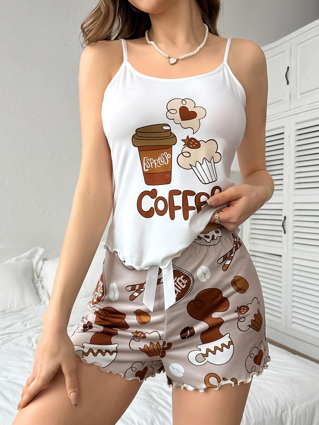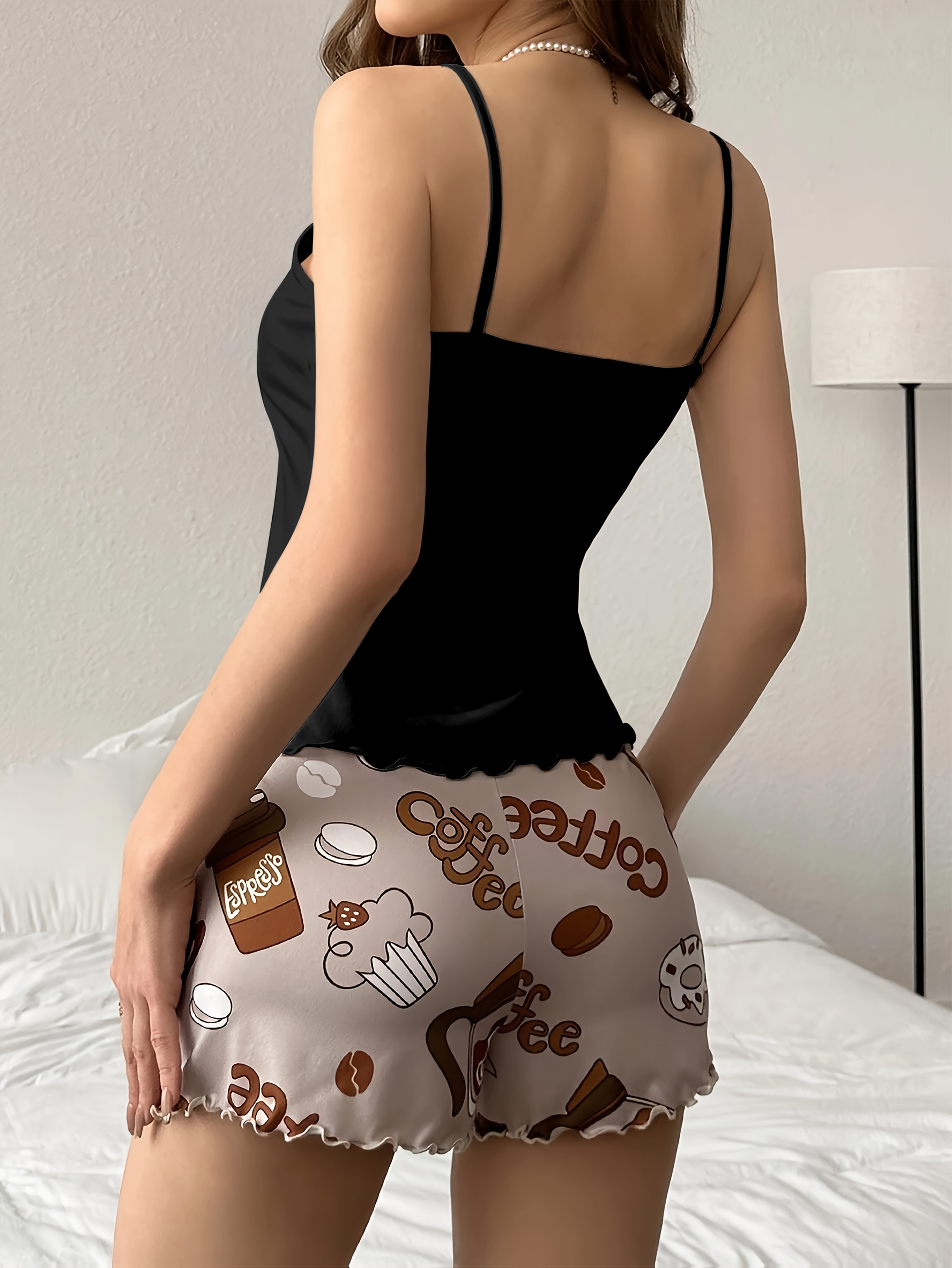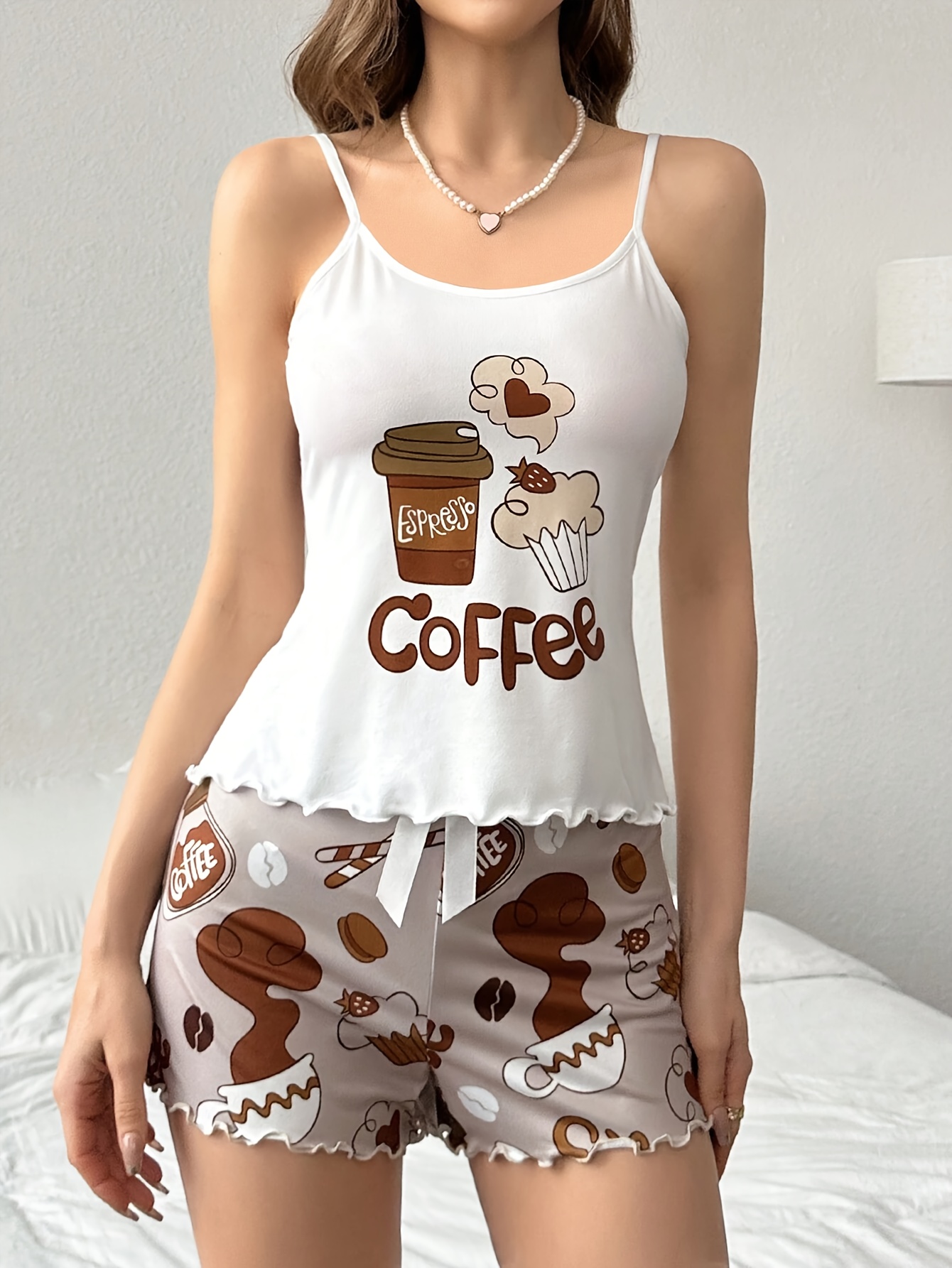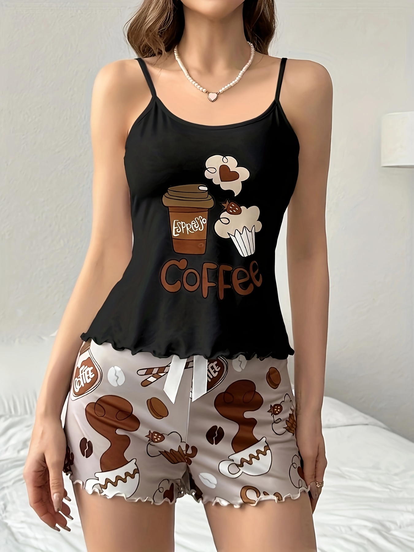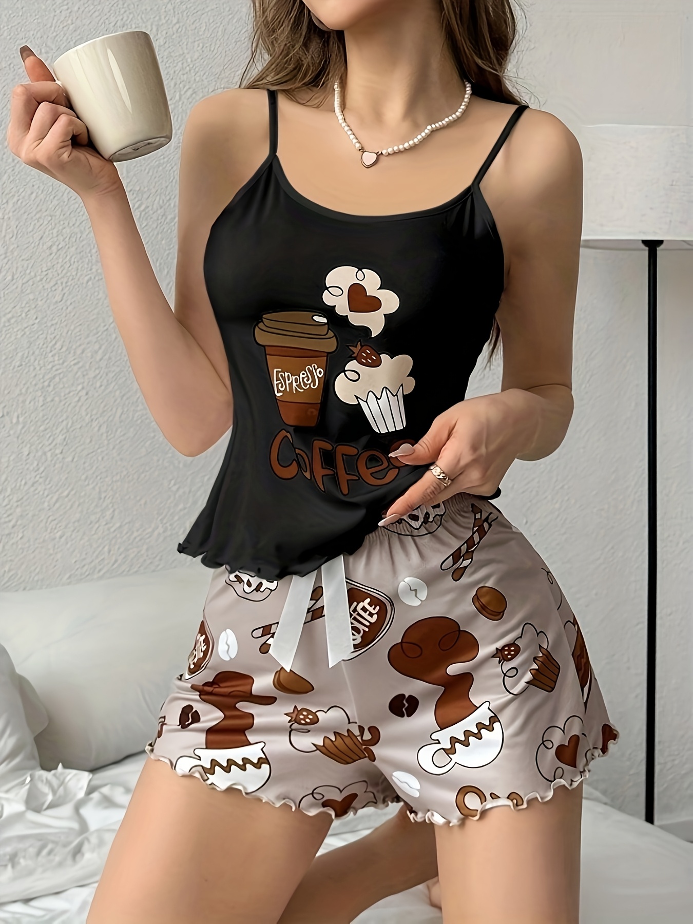 Women’S Coffee-Themed Camisole Pajama Set with Bow Belt, Cute Cartoon Print, Loose Fit and Elastic Waistband, Perfect for Sleepwear, Machine Washable & Dry Cleanable