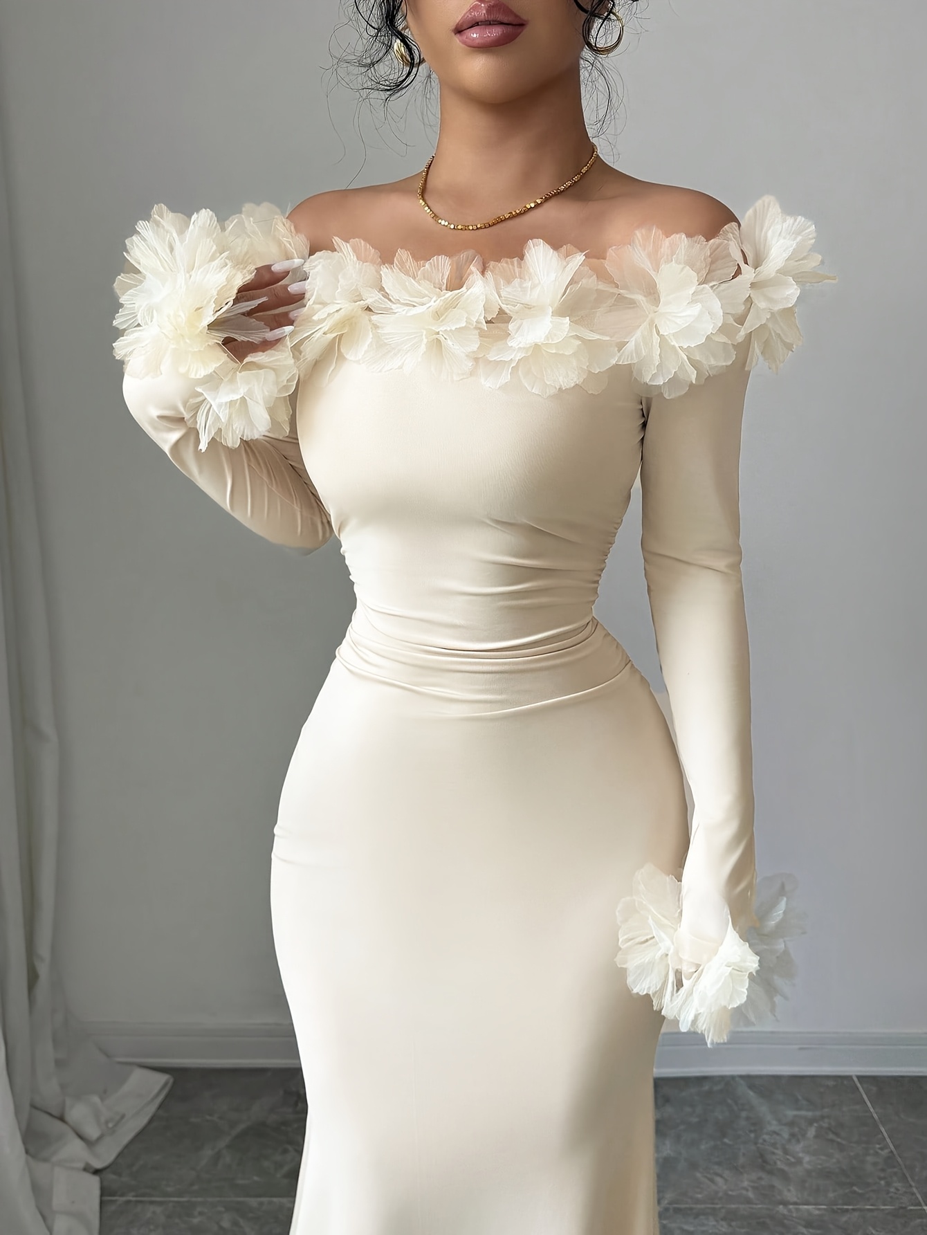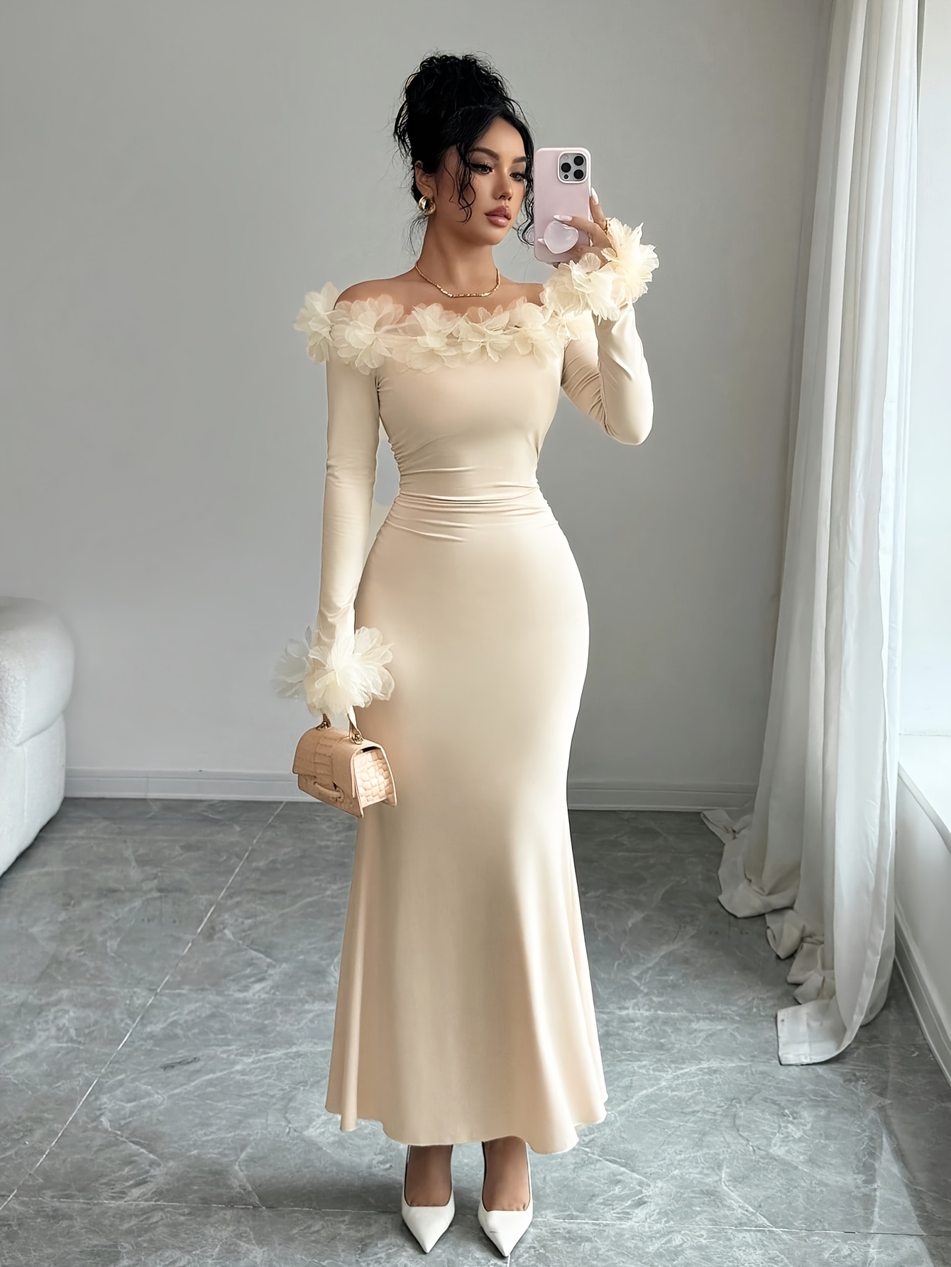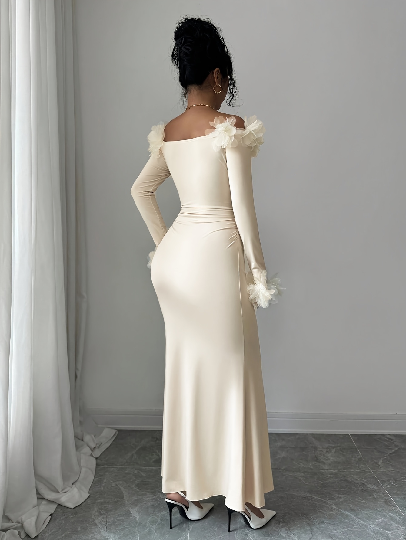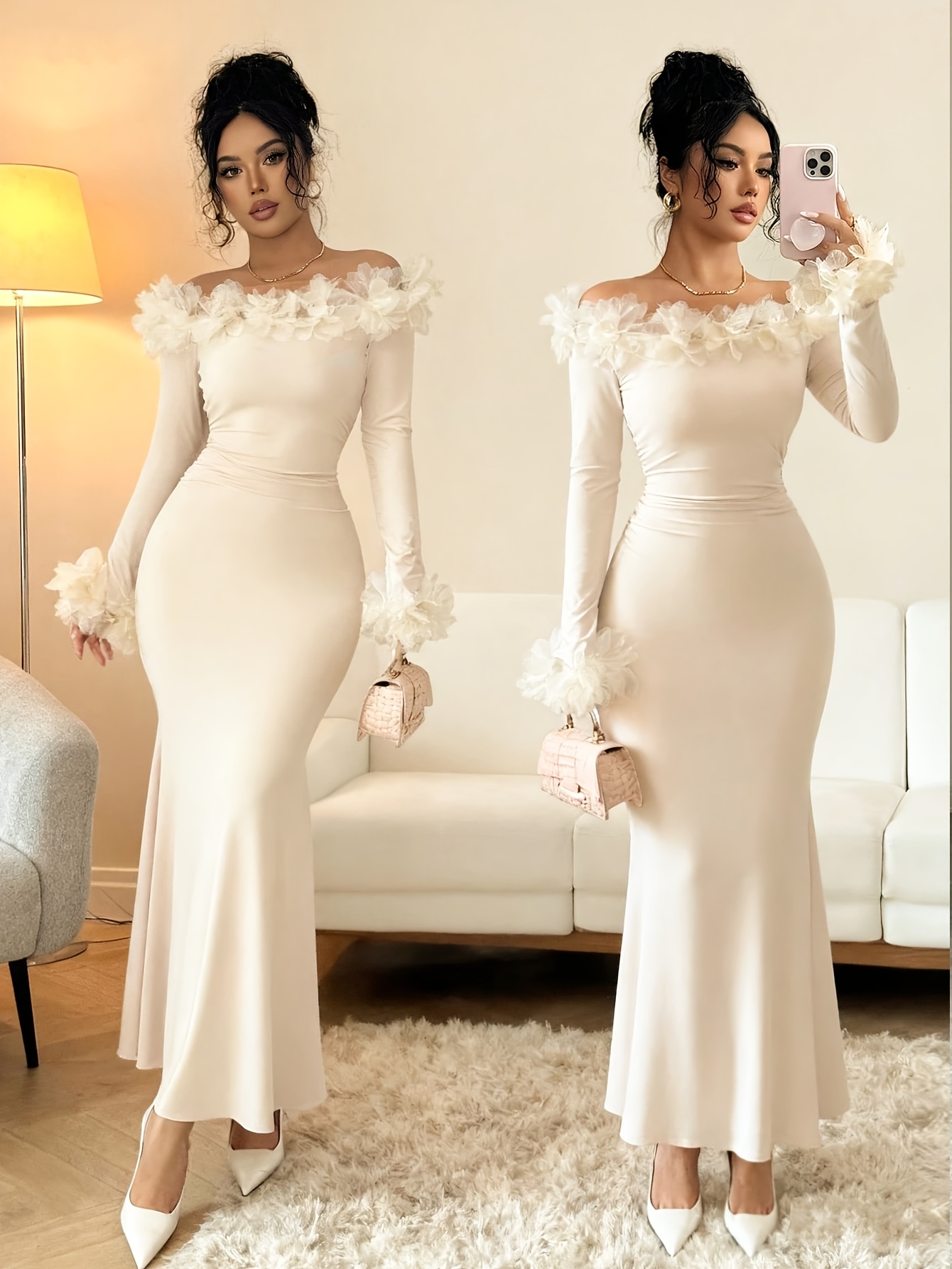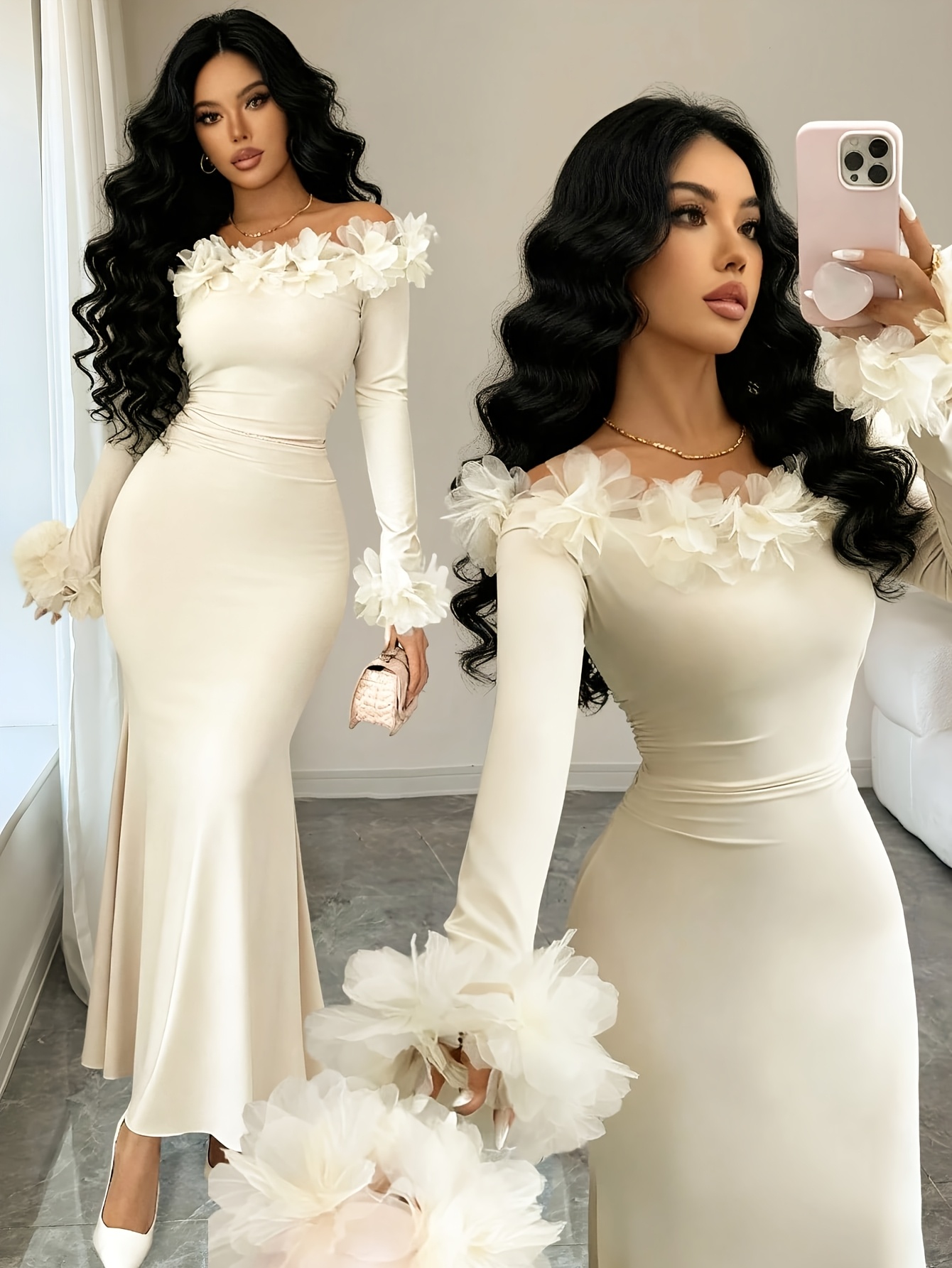Women’s Elegant and Fashionable Solid Color Floral Embellished One-Shoulder Neckline with Lace Trim on Neckline and Cuffs, Waist Gathered Fit-and-Flare Long Sleeve Mermaid Sheath Evening Gown