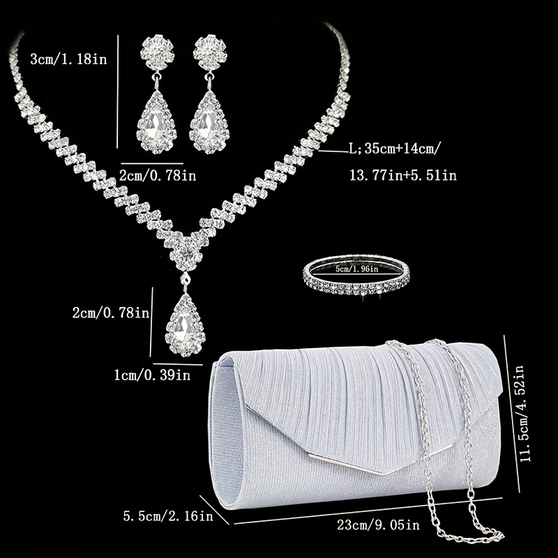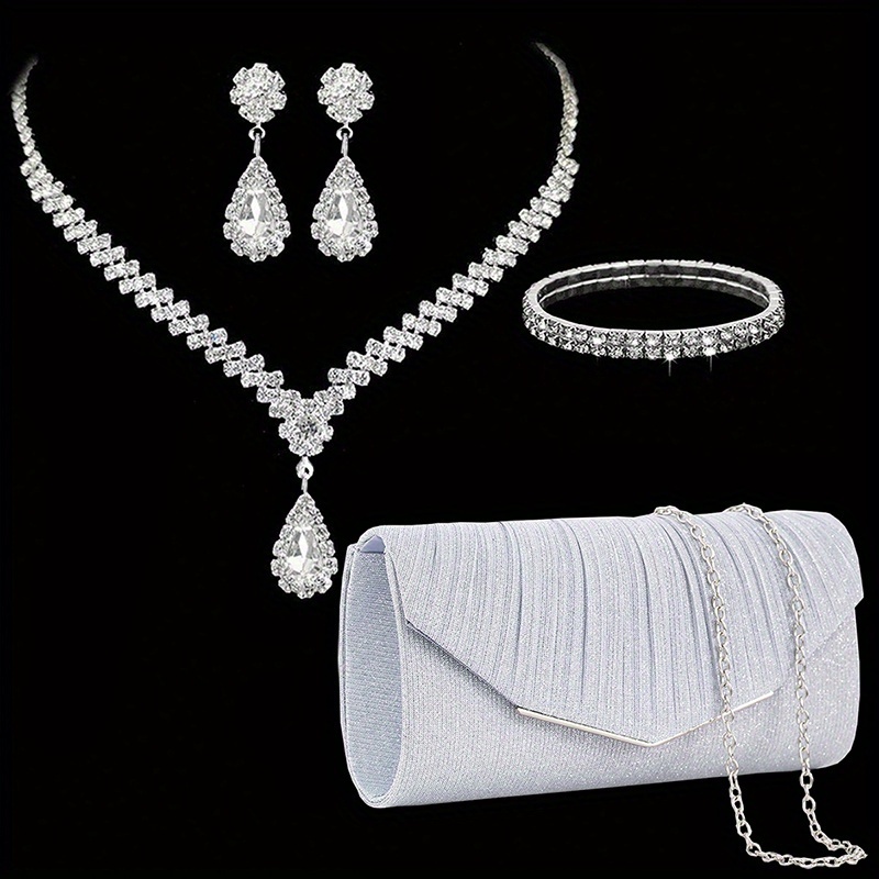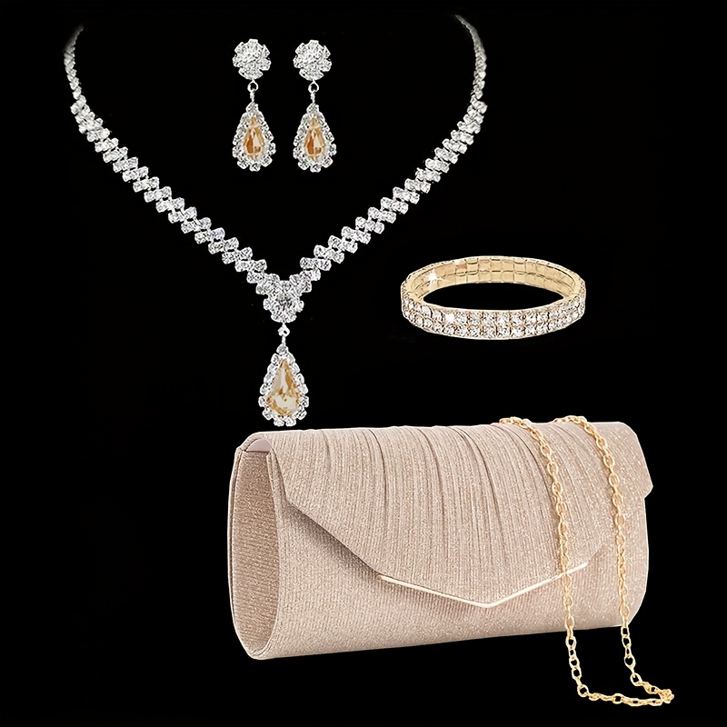 Women’s Fashion Versatile Elegant Rhinestone Decorated Clutch Evening Bag Chain Shoulder Bag Dress Bag Necklace Earrings Bracelet Banquet 4pcs Set