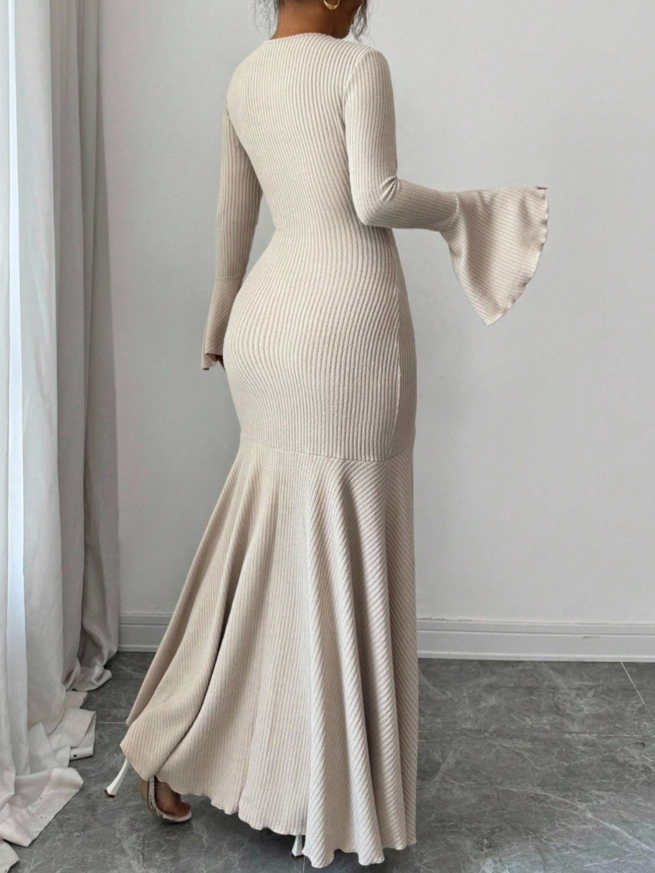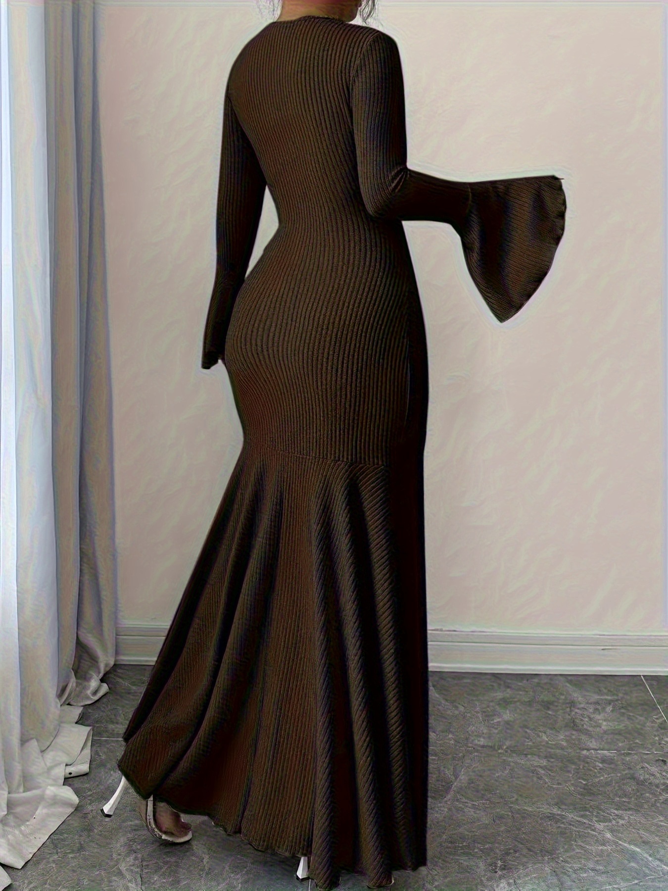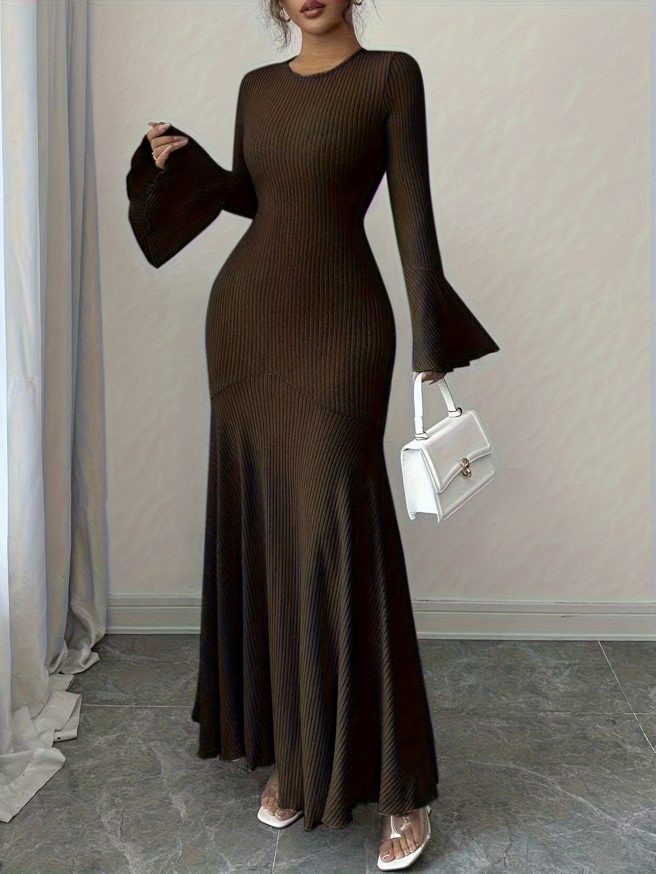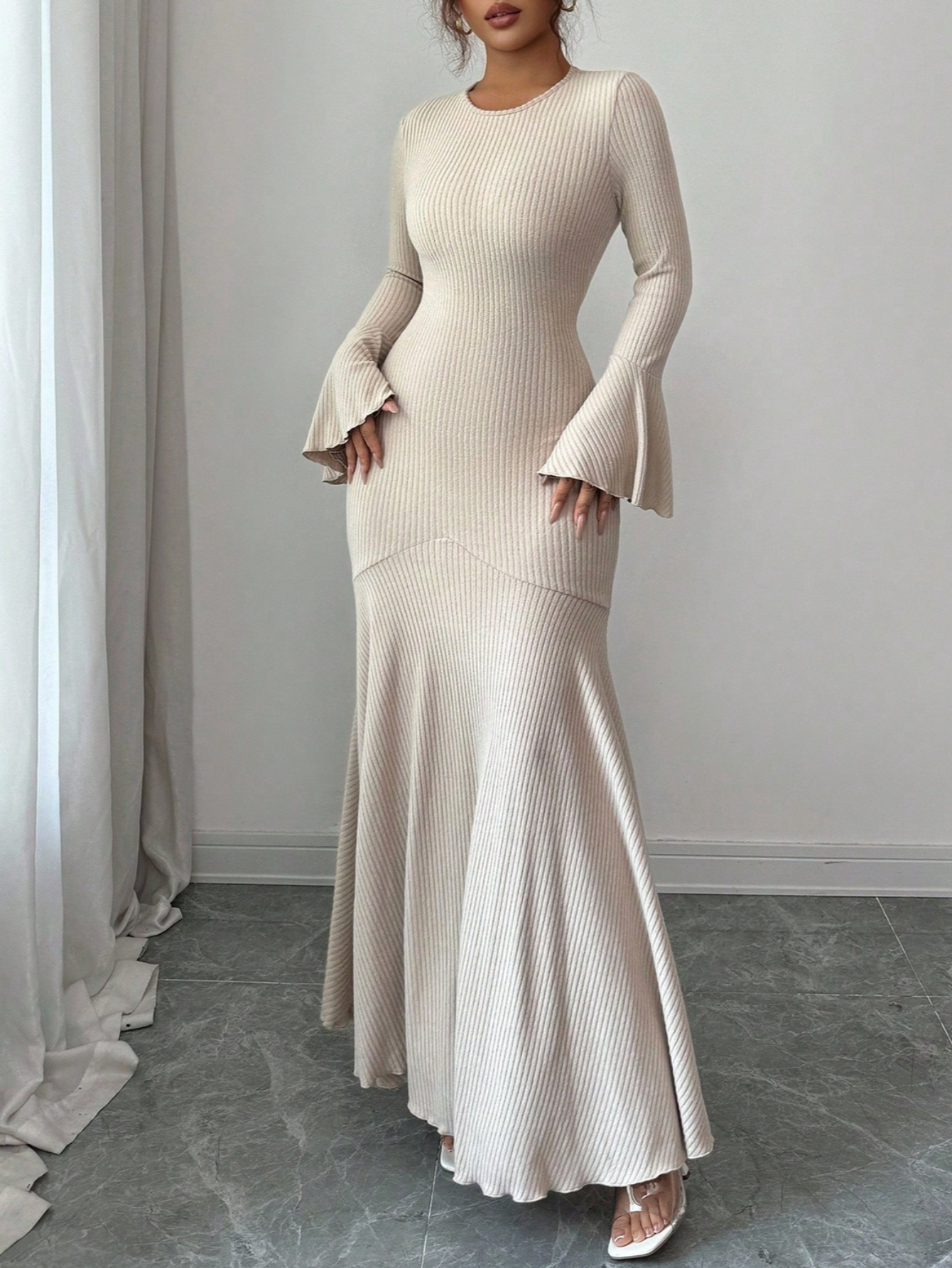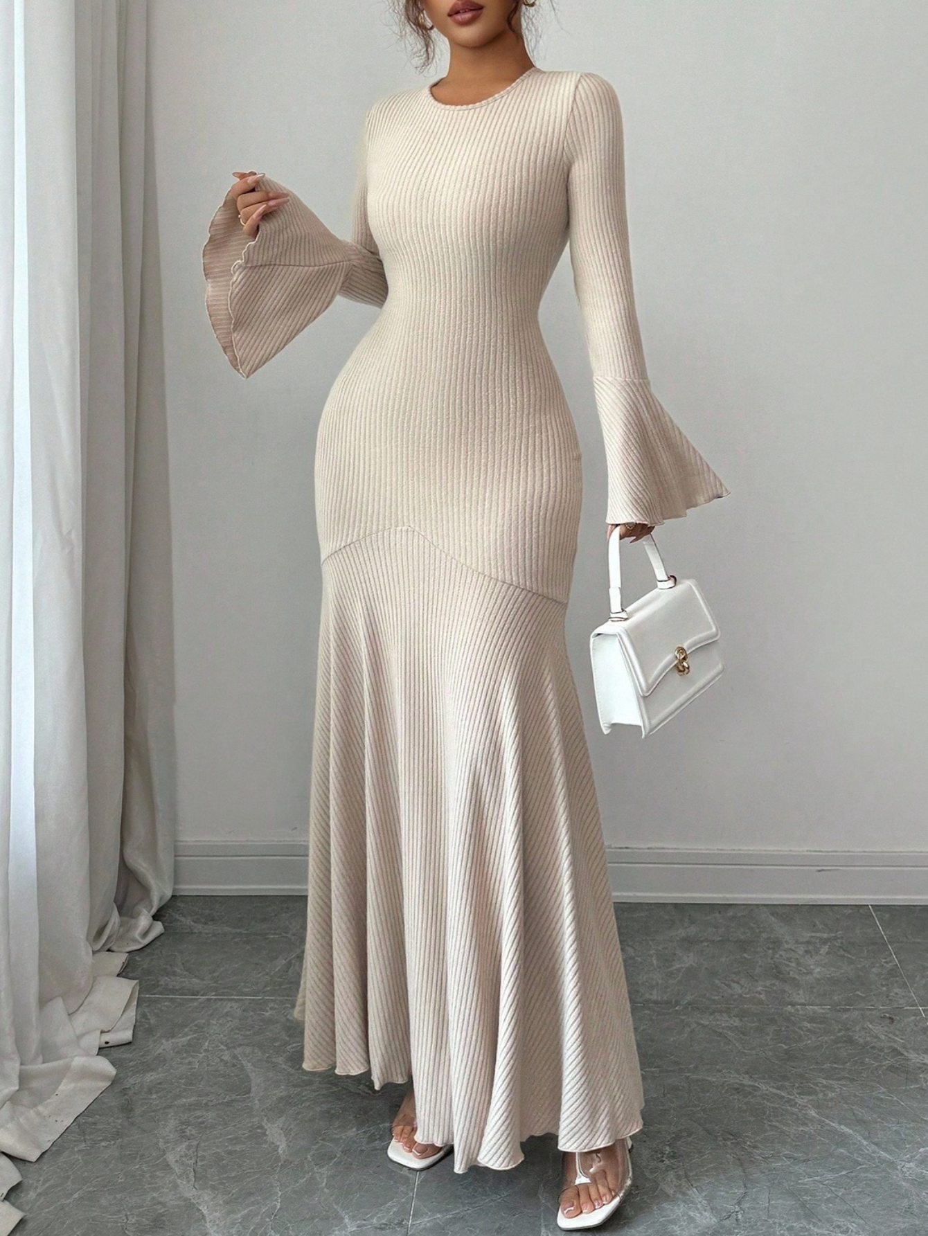 [Women’s Mermaid Dress] 2025 Spring And Autumn New Women’s Round Neck Dress – Long Bell Sleeves, Ribbed, Fitted Mermaid Skirt – Stylish And Flattering, Comfortable And Versatile – Suitable for Commuting And Dating
