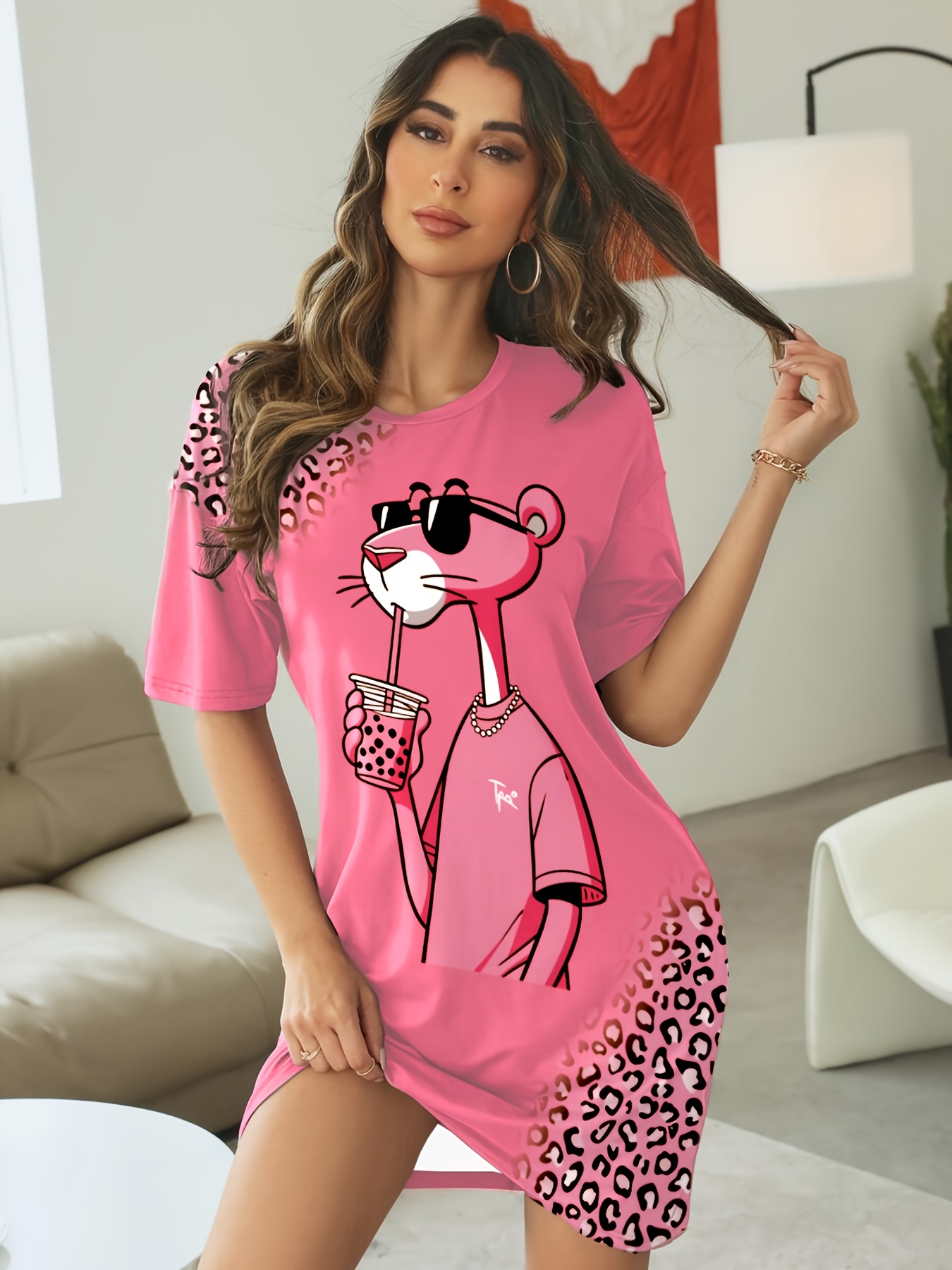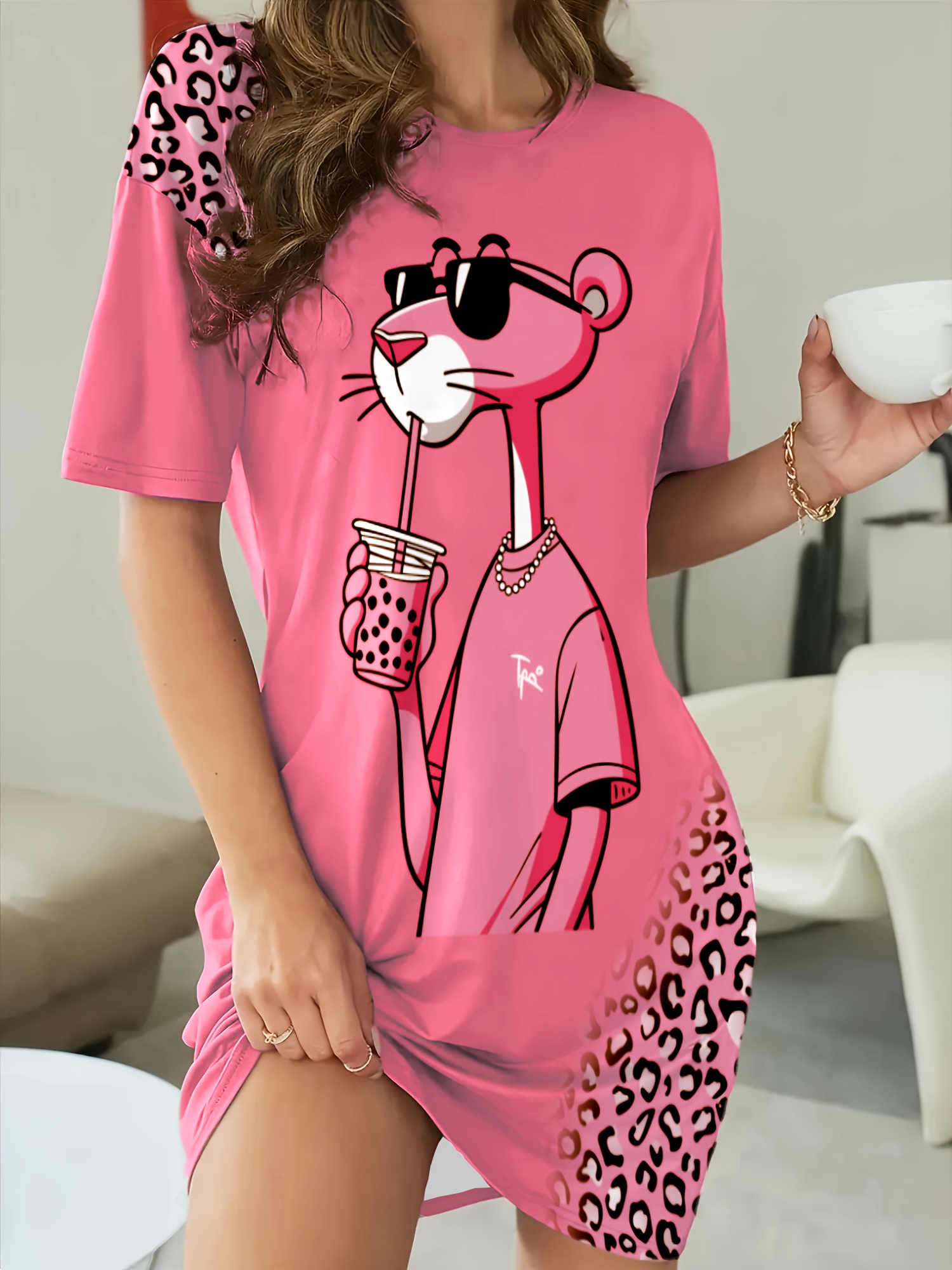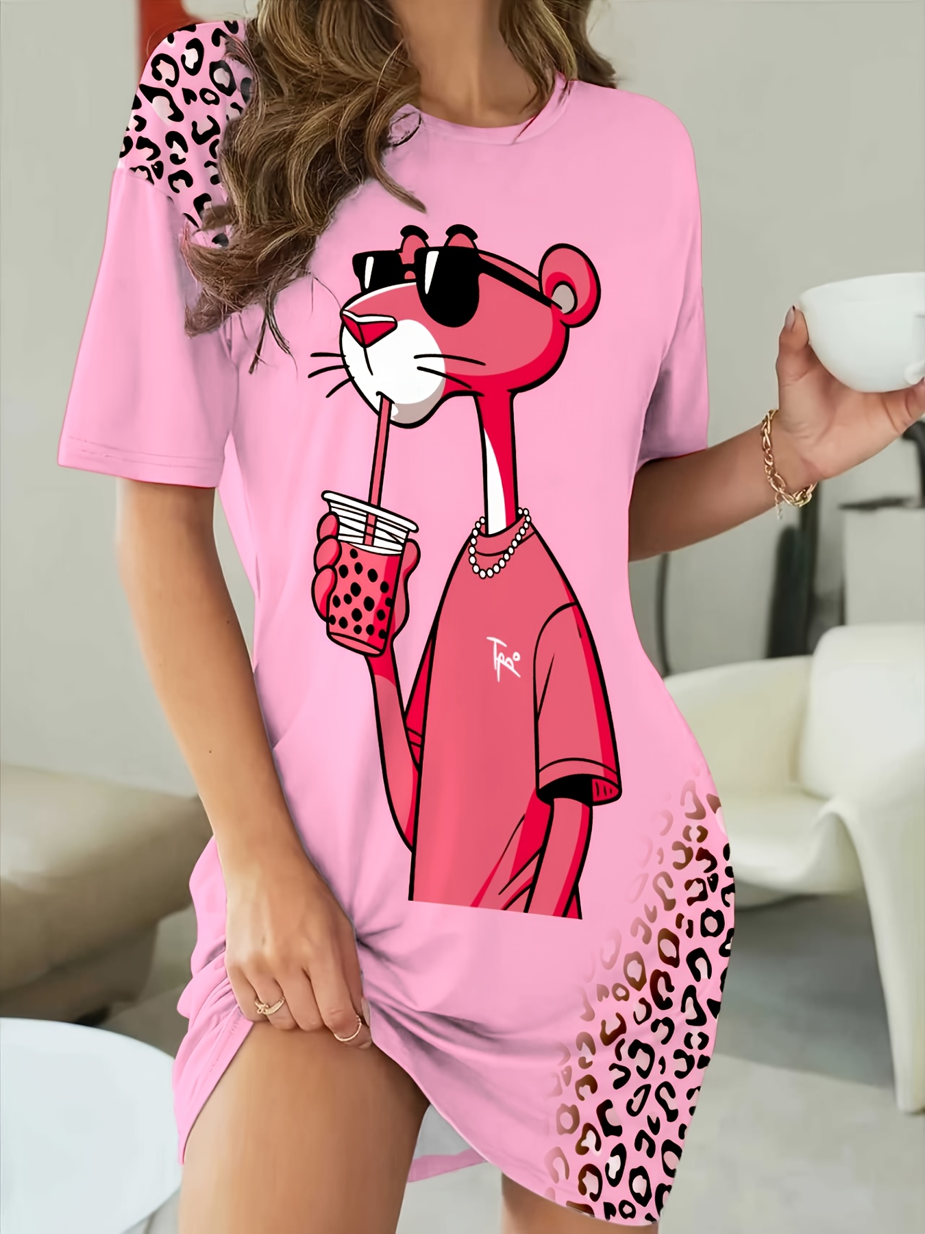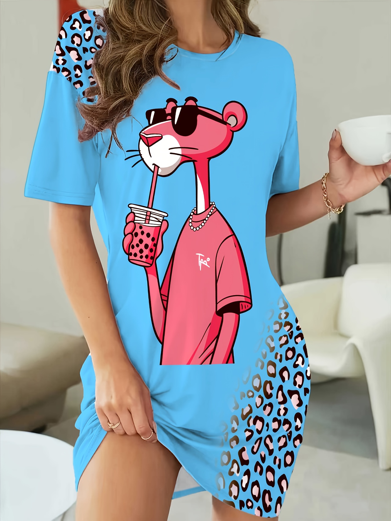 Women’s Nightdress with Cute & Bunny Print – Soft Round Neck Sleep Dress, Machine Washable All-Season Pajama for s, Cozy Bedwear for Pregnancy & Menopause (if comfortable, conditions should be considered)