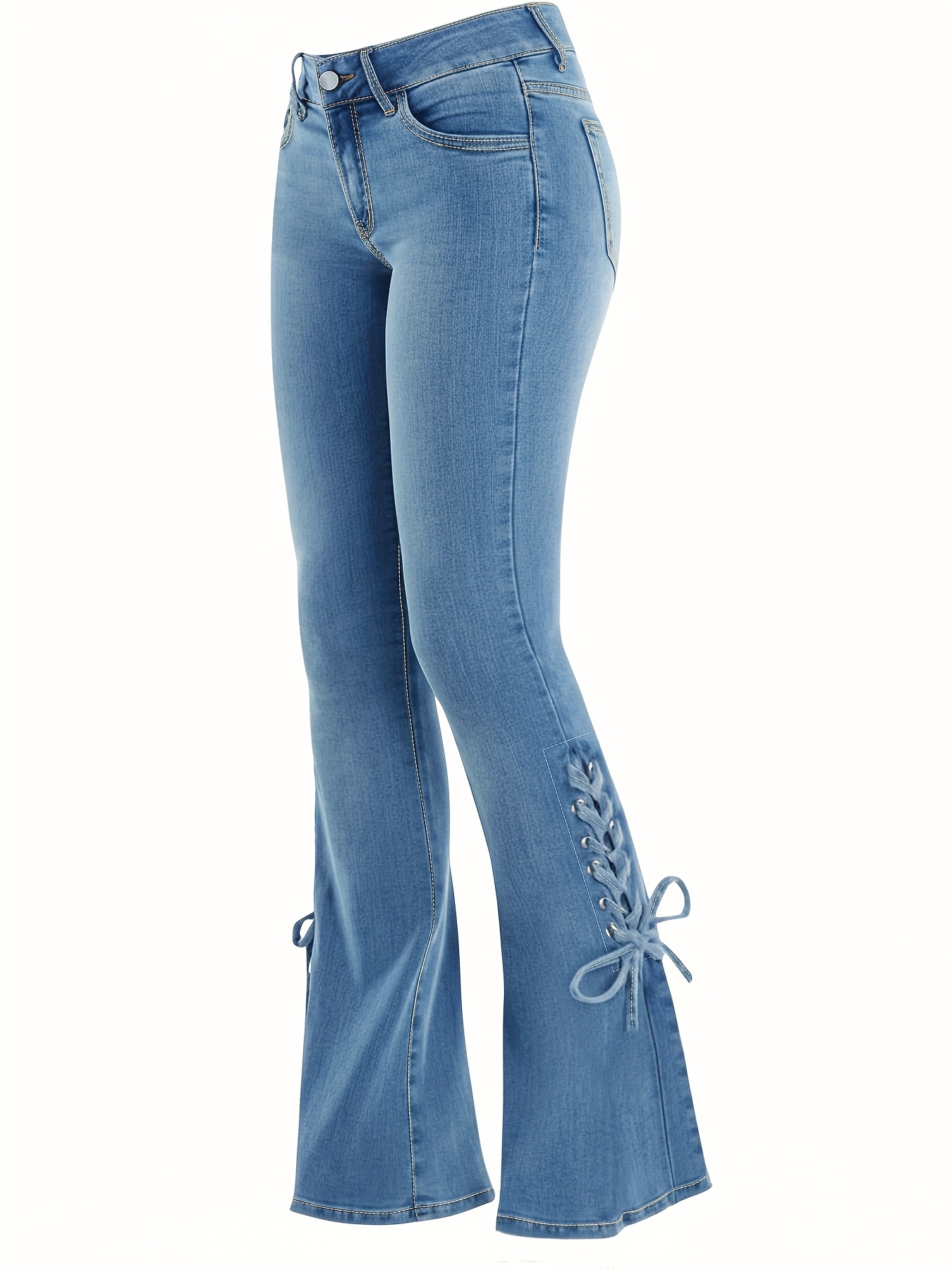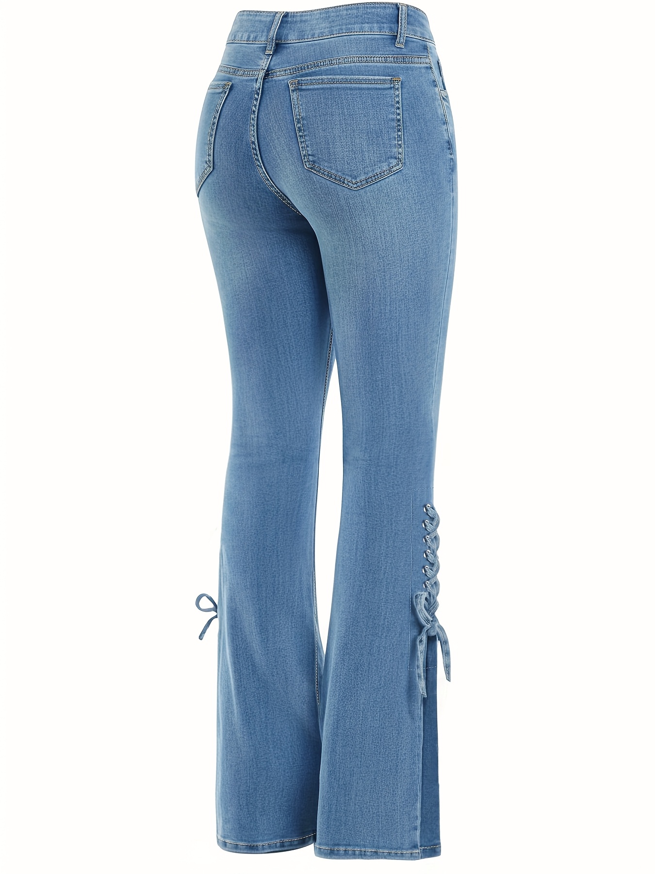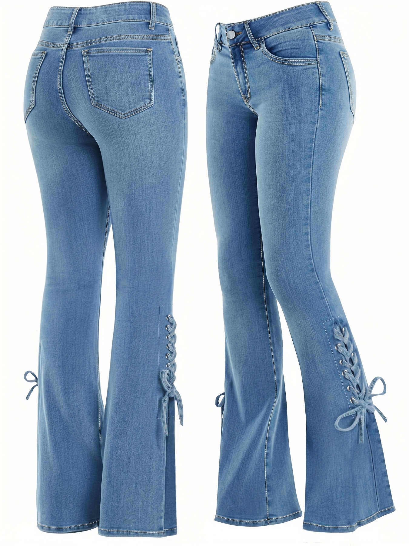 Women’s Plus Size High-Waist Stretchy Wide-Leg Flare Jeans – Beltless Waist & Cuff Tie Closure, -Washed Blue Denim Pants, Slim-Fit Trousers for Mature Women, All-Season Wear (Casual/Dress) – Machine Washable