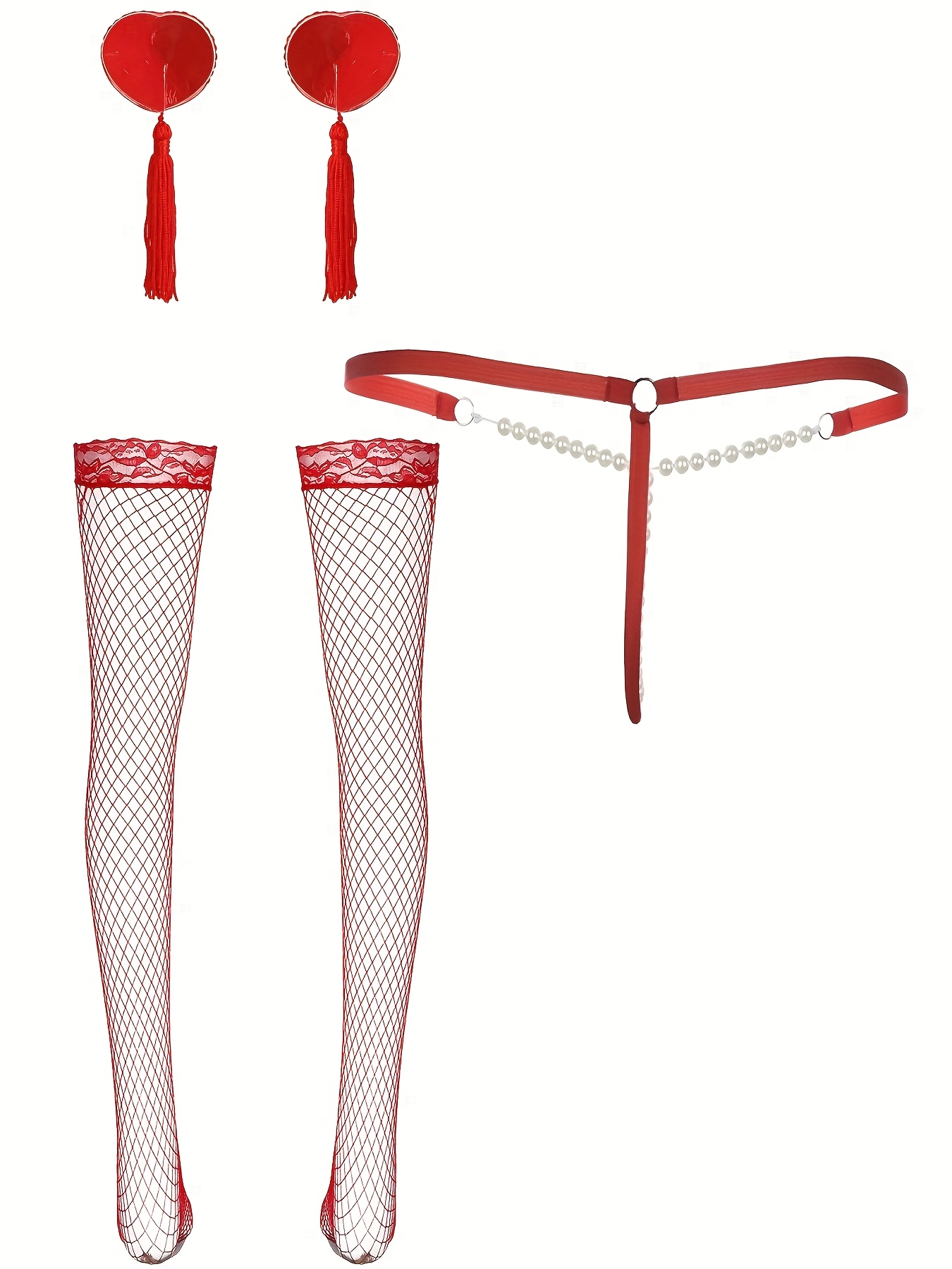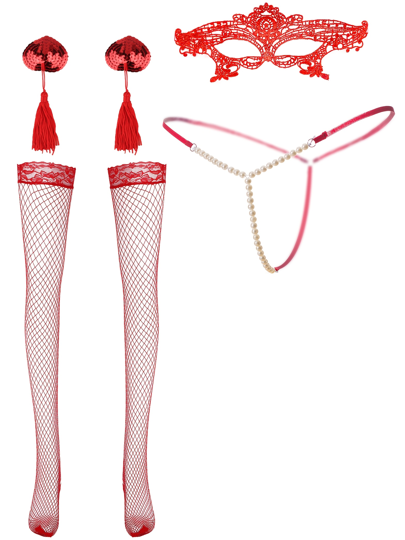 Women’S Sexy Lingerie Set (1 Pearl Thong + 1 Pair of Nipple Covers + 1 Pair of Fishnet Stockings + 1 Lace Eye Mask)