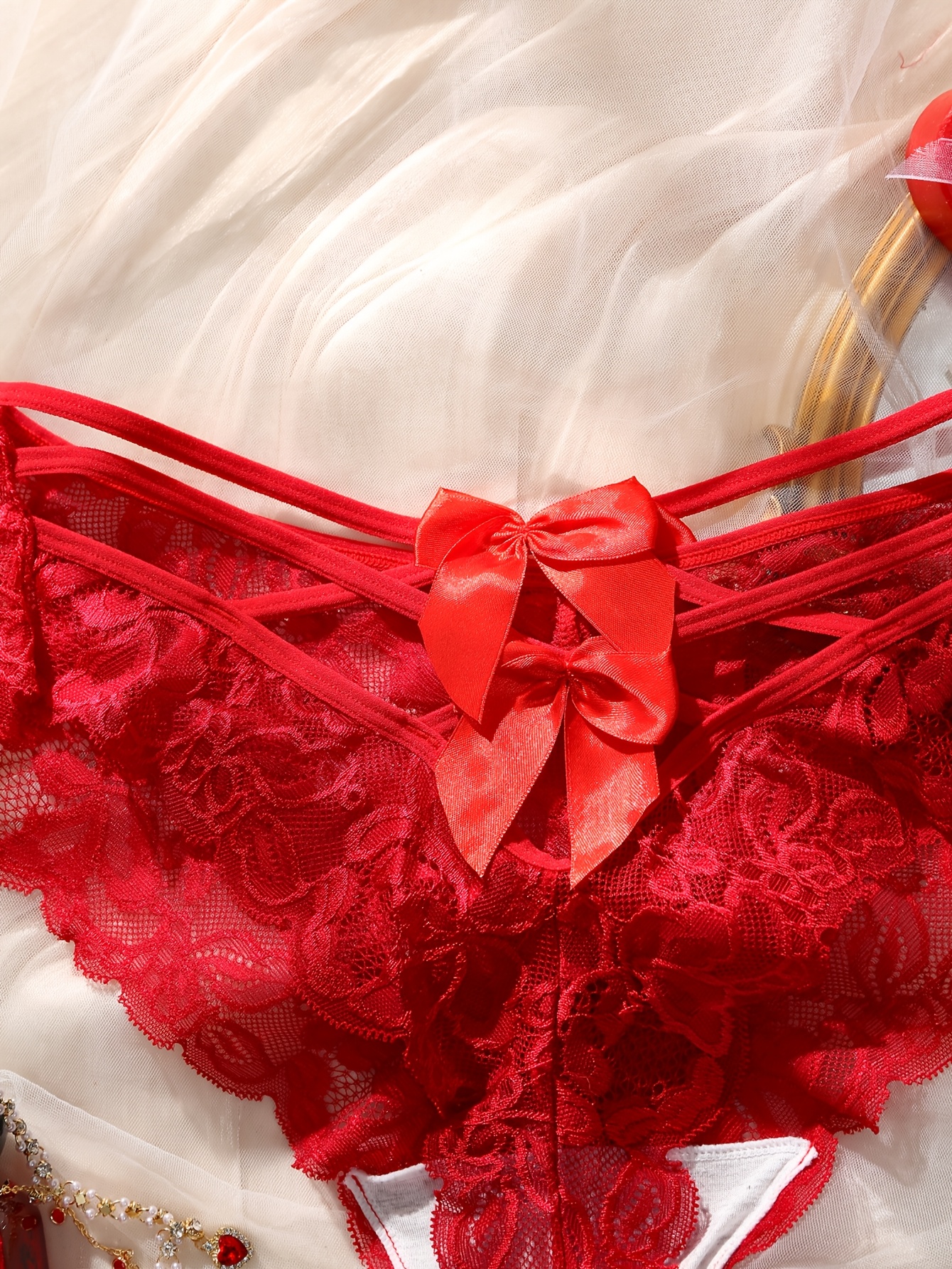 Women’s Sexy Red Lace Bikini Underwear – Semi-Sheer Bow-decorated waistbow & matching briefs, Romantic Lingerie for Valentine’s Day, Bridalwear, Special Occasions – Hand Washable Feminine Panty