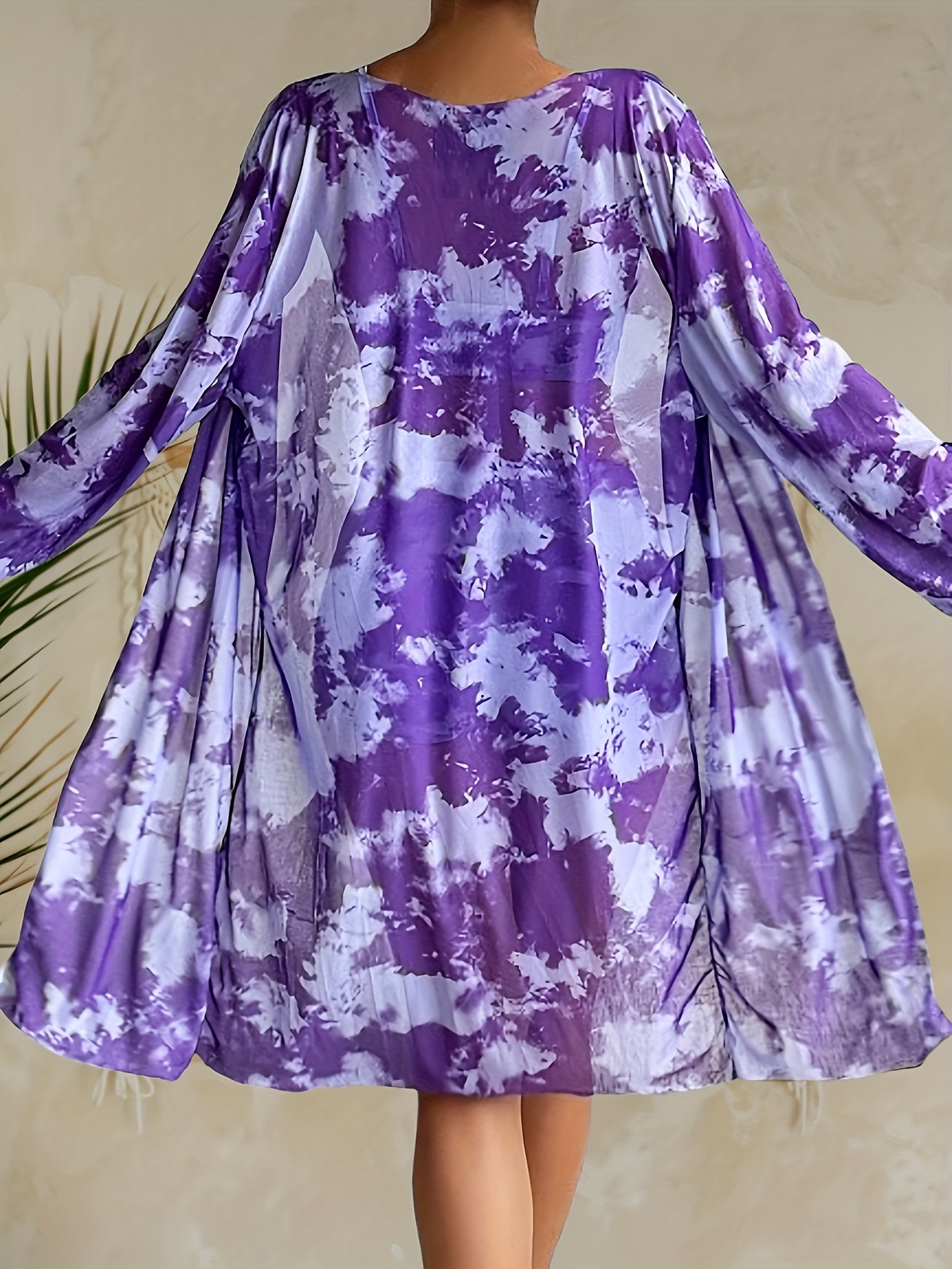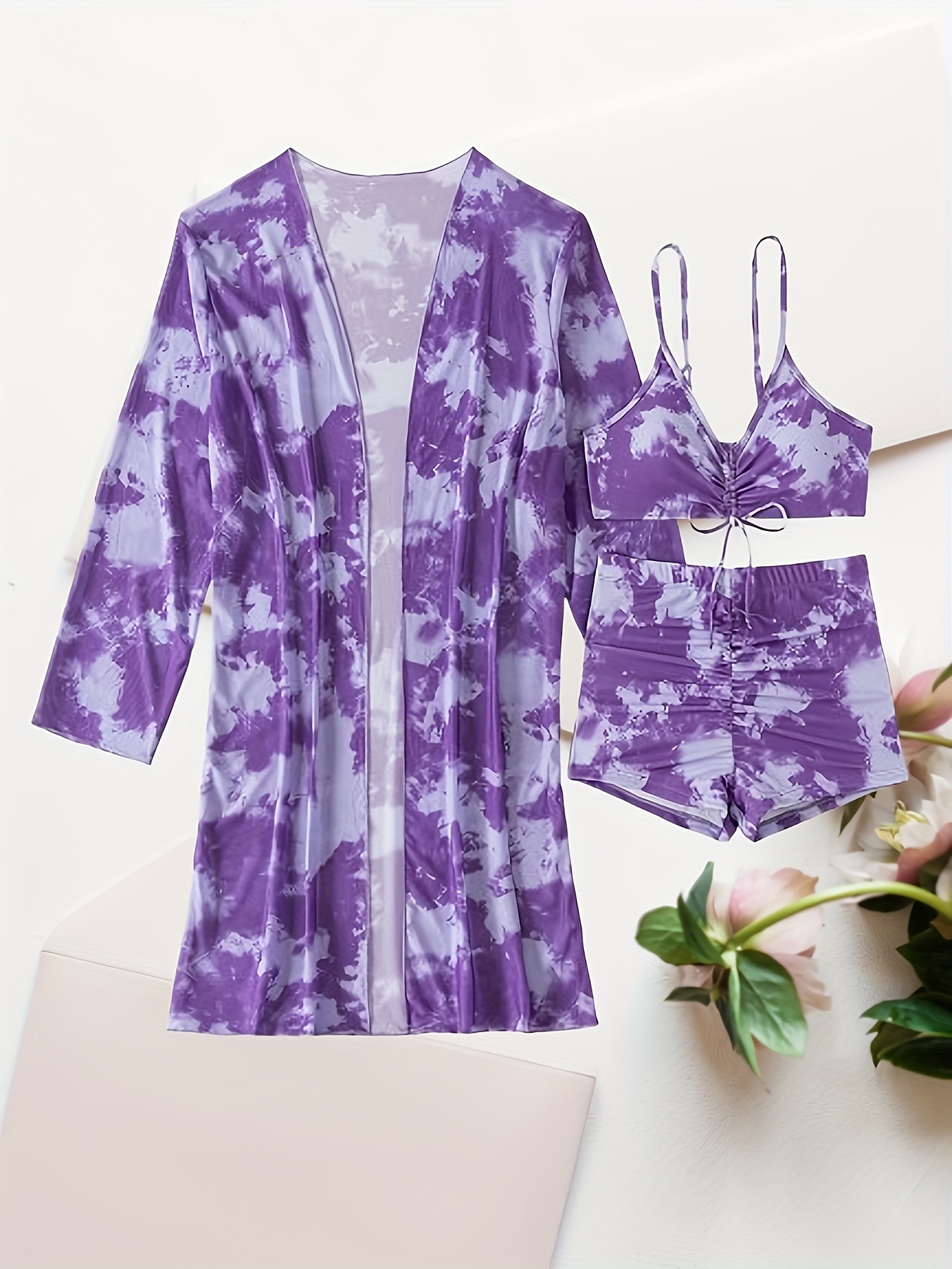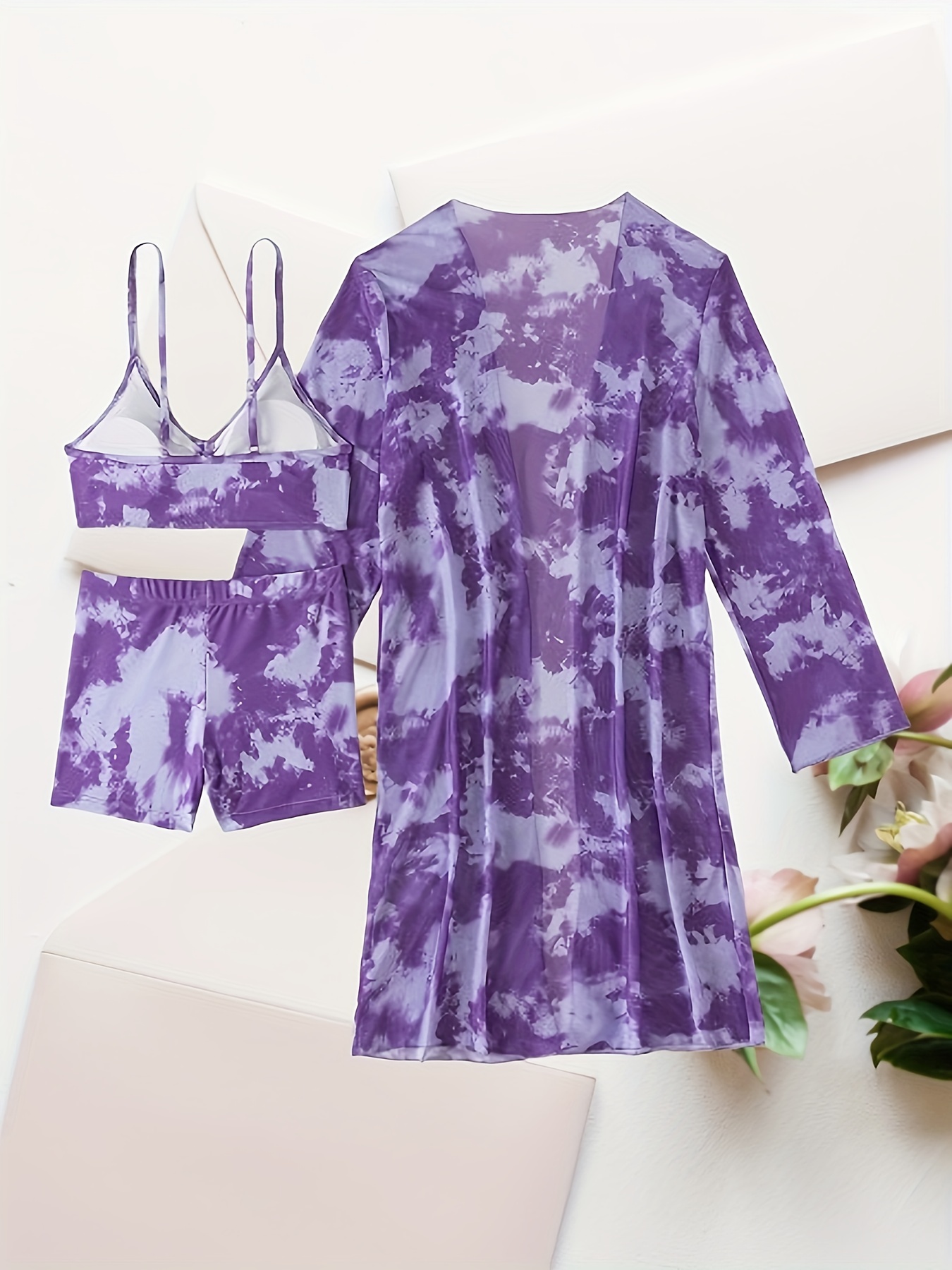 Women’S Vibrant Tie-Dye Bikini Cover-Up Set – Loose Fit Beach Jacket with High-Waist Bikini Bottoms, Stretchy Polyester, Pockets, Perfect for Vacation & Swimwear